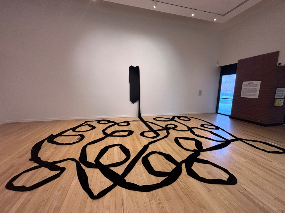 These artists all occupy a space shaped by craft traditions, including sewing, weaving, and fashion, but their blending of metaphor and technique deepens the resonances of each piece. Yu-Wen Wu’s Recitations (2024) is formally beautiful, and upon closer inspection, reveals that each fuzzy ball is actually dried tea leaves glued together, the balls strung together with knotted red thread. Alison Croney Moses’s carefully crafted wood piece is one of the most striking I’ve seen of her work, hung in a way that emphasizes the multiple shadow play on the walls.