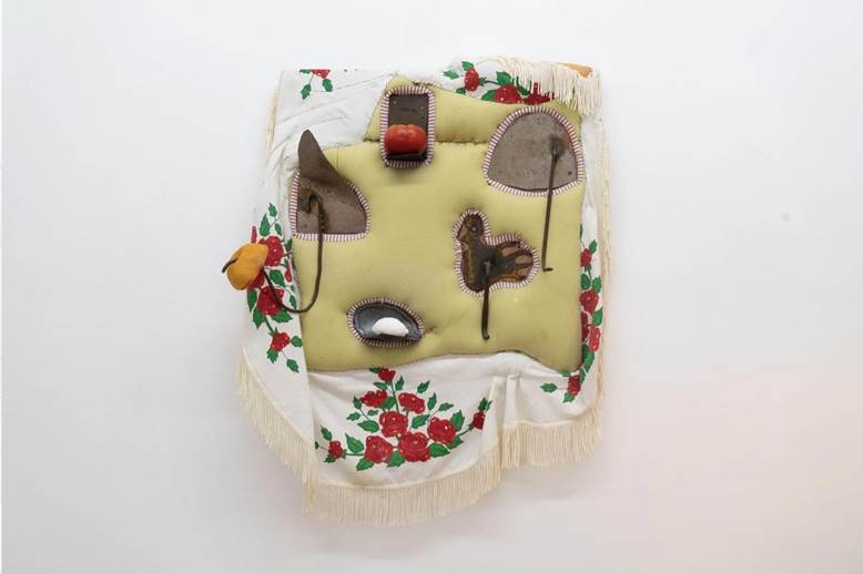 Gabrielle Constantine’s The Blossoming of Aspartame makes sacred the trivial objects that mark time, sweat, and labor, creating a new definition of homemaking. Constantine demonstrates a keen intuition of identifying the sentimental value of functionally “unbeautiful” moments like rusted iron tools or taped produce box floor covers. She builds a catalog of working-class textures: cork, rubber bands, cardboard, rust, quilts, and dried paint splotches, to create an environment that is authentically curated, lived in, and lovingly worn.