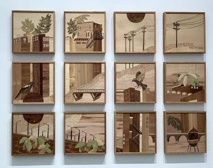 Arden Carlson’s recreation of objects in basswood, maple, and pine feel like they are from a far off memory in their light hues. Klara Knutsson’s Fragment series are a showcase to the possibilities of wood veneer in creating detailed landscapes. Asem Kamal combines his craft with his documentary practice in flipbook machines that capture each Fellow as they work. Allen Laing’s Delawarean Red-Bellied Woodpecker Plume Mask commands attention with the unique characteristics of found wood in a three-dimensional scale. Nifemi Ogunro confidently creates a visual poetry with her bent and found wood sculptures that stop you in your tracks. Edgar Orlaineta’s play between the functional and the decorative invites slow looking for visitors to notice the precariousness of the assembly and the significance of its accompanying objects.