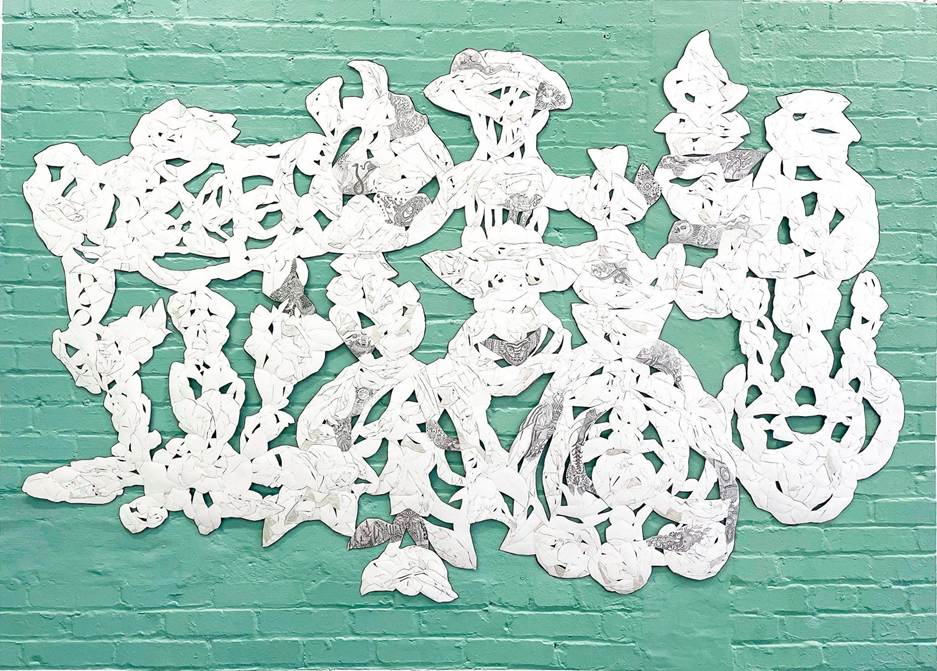 Stracke’s solo exhibition, Votive, is a visual representation on the precarity and reconstruction that surrounds visual mythologies. In highly compressed graphite drawings, Stracke documents the stylized characters, landscapes and patterns that build onto each other to create an all-encompassing landscape of cultural preservation. Stracke expertly layers drawings of humans, fish, flowers, and deities seamlessly as if it were a continuous line drawing. These friezes are then cut and pieced with shards of hanji and other textured papers until they create new architectural forms.
