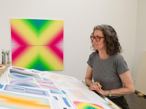 OnEdge” at The Painting Center features ten contemporary painters who interpret the notion of ‘edge’ in their abstract paintings, conversing with mid-20th century abstraction sensibilities like Op Art and Washington Color, or early Mondrian.  Patrick Burns, Anthony Falcetta, Astrid Fitzgerald, Lori Glavin, Celia Johnson, Julie Karabenick, Richard Keen, Scot Sinclair, Audrey Stone, and Jennifer Woolcock-Schwartz  explore the tension between separation and union with color and line.  In her curatorial note,  Susan Post says that the shift between separation and union triggers the sensation of being ‘on edge’ – a prevalent state of mind at the moment.