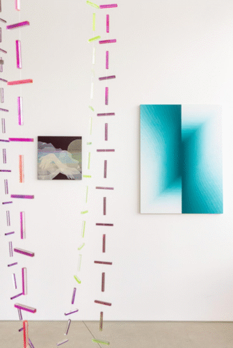 Walking into this show on a cold, blustery night, you are greeted by large windows illuminated out by gallery light. Inside, you are met with a collection of color, light, and energy. Each piece in the exhibition Spectral Evidence uses mainly acrylic to illuminate new spaces by dissolving edges, blending colors, and allowing gradients to calmly and smoothly envelope the space within the works. While each artist in the show has their own take on creating their own spaces, they use many conventions of painting and abstraction to create new forms and environments to experience, and each piece seems to flow well into the next. The gallery layout lends itself to a meandering space.