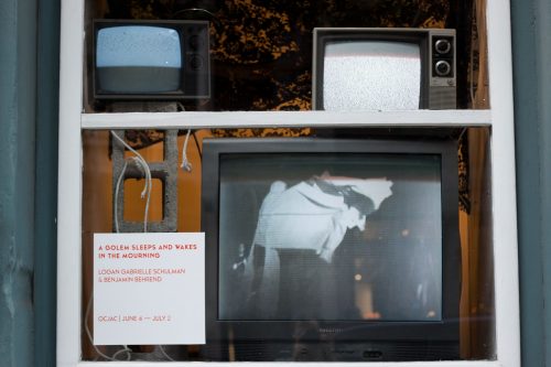A Golem Sleeps and Wakes in the Mourning, featuring works by Philadelphia based artist Logan Gabrielle Schulman and writer Benjamin Behrend, is a collaborative interactive exhibit of images, objects, and video from the theatre of grief, on view at the Old City Jewish Arts Center in Philadelphia, PA through July 2nd. Benjamin Behrend, a writer and performer, says he has recently been straddling the worlds of comedy, performance art, and also various explorations of faith, especially these past few years. Logan Gabrielle Schulman (they/them) is a queer interdisciplinary artist, with a background in theatrical performance, directing, playwriting, and designing, while also developing over the last few years a foundation in the visual arts. They say their work “primarily investigates modern crises of faith and collapse,” which they started investigating initially by drawing on their theatrical design experience through installation work, and gradually later on, in smaller scale work as well. Schulman’s work also draws upon their experience as a Jewish educator teaching about the Jewish diaspora and Holocaust history.