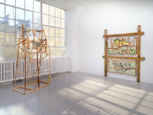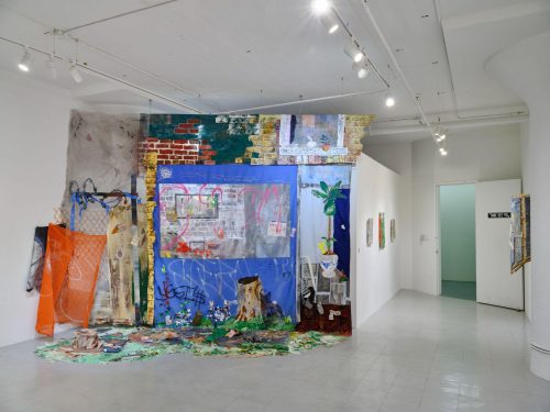 In the three person show Aggregate at Studio 9D, artists Sammy Bennett, Bradley Milligan, and James Bertucci channel New York streetscapes and detritus to relay an earnest and affecting impression of the city. Bertucci’s trompe l’oeil paintings, Bennett’s fabric installation, and Milligan’s rugged sculptures overlap in a reverence for craftsmanship. Labor and construction are this show’s subject and, in many ways, its medium. In its use of material and representation Aggregate is boldly literal in its translation of the city’s chaos and beauty.