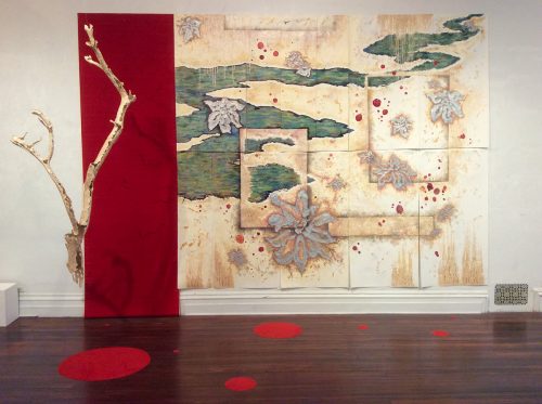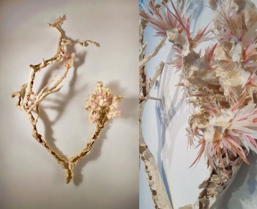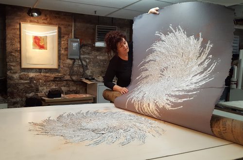 Brandon Graving aims to transfer and translate a sense of wonder in her artworks. She describes her process of making as exploring the connectedness of all things with ongoing “delight, immediacy and a sense of virginal untamed discovery with a nod towards Humbolt.” Some of her sculptural works are kinetic and turn, revealing elaborate intricacy and shadow play, while other works, including monoprints with handmade inks and semiprecious stones, alter dramatically in different light. She does not intend to depict nature but rather hone ideas and objects into simplified essential forms, some with elaborate treatment. Through her extensive attention to detail, she reflects on how the micro and macro within the work suggest a system that is both diverse and similar, how these dualities interrelate or even duplicate in nature.