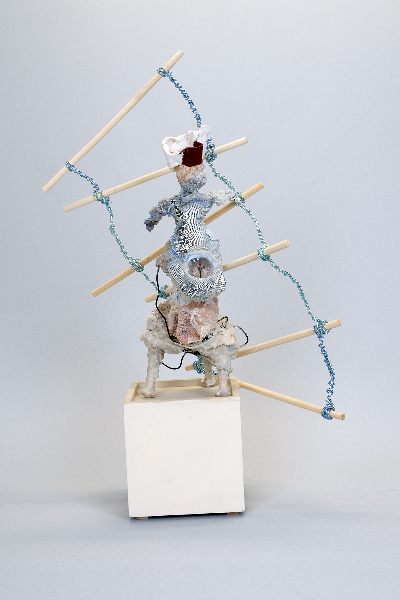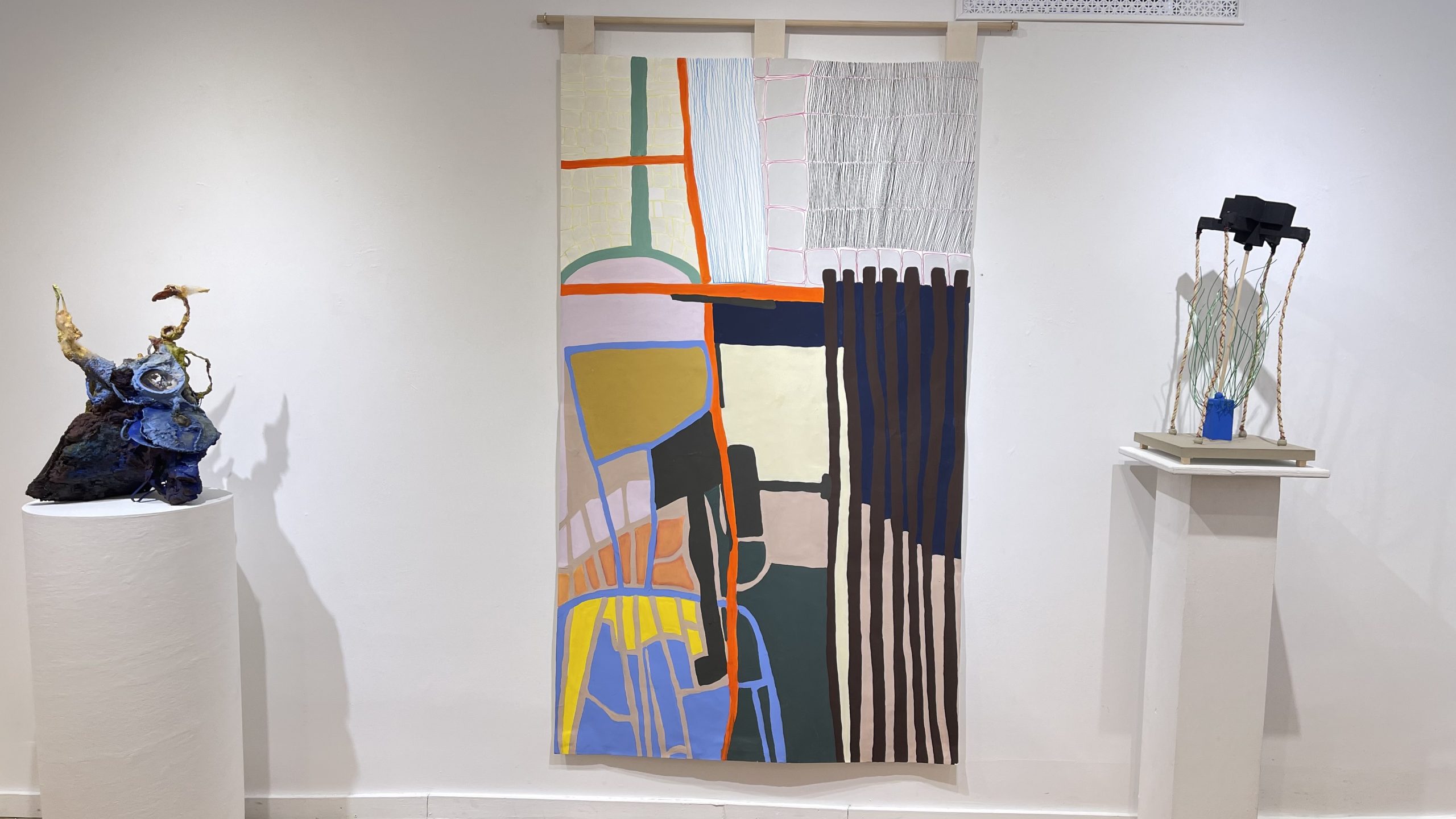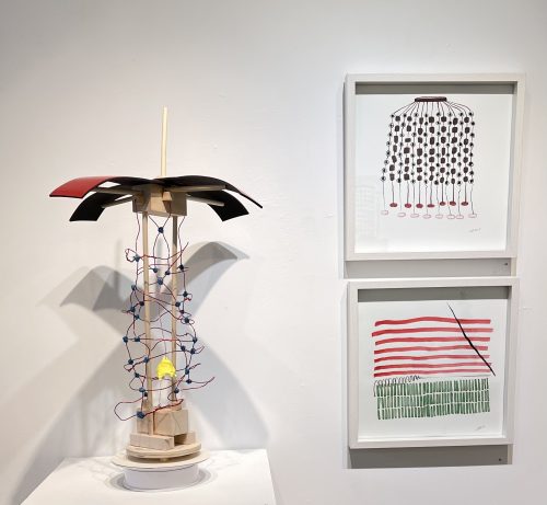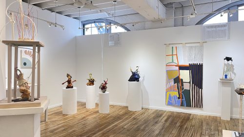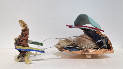 Carole d’Inverno and Susan Rostow live a block apart. Over the past year, they passed sculptures between studios, texted images and material references, built paper maquettes, and revised their work without fixed goals. Fellow Imaginaries, now on view at Atlantic Gallery, result from this sustained exchange. The exhibition includes fully collaborative hybrid sculptures made jointly by d’Inverno and Rostow, alongside individual works by each artist: sculptures by Rostow and both sculptures and paintings by d’Inverno. Though distinct in authorship, all the works were developed in close dialogue. They respond to one another in form and material and in how they occupy space. Walking into the show feels like entering a toy store—joyous, playful, a place of invention. The visitor becomes a child again, wondering how things were made and how they might move.