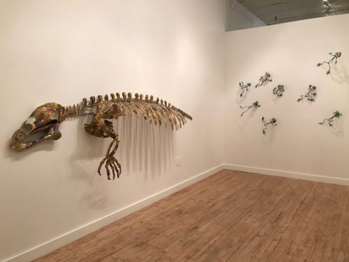 Concern with Climate Change and how it impinges on our planet links the five artists featured in the impressive sculpture show at David&Schweitzer. Running the gamut from minimalist to narrative sensibilities and from found objects to fabricated materials, the sculptures created by Ruth Hardinger, Babs Reingold, Rebecca Smith, Kelin Perry, and Christy Rupp, engage the space in juxtaposition to one another – visually situating the overall exhibition at the intersection of natural history and archaeological excavation, thematically layered and at times poetic. The artworks in the show refer to the underground, trees, atmosphere, underwater, and animals- each of the individual parts that is essential for life on Earth.