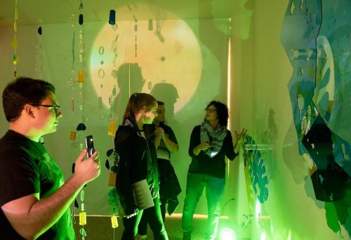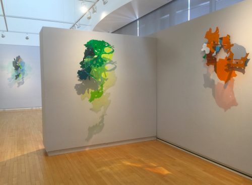 Debbie Hesse, the CT based artist, makes plexiglass sculptural constructions and video installations. Her sculptural installations, or “spatial paintings” are typically made of multiple planar Plexiglas and wood cutout shapes layered to create complex shapes which bring her ideas to life through light and color.