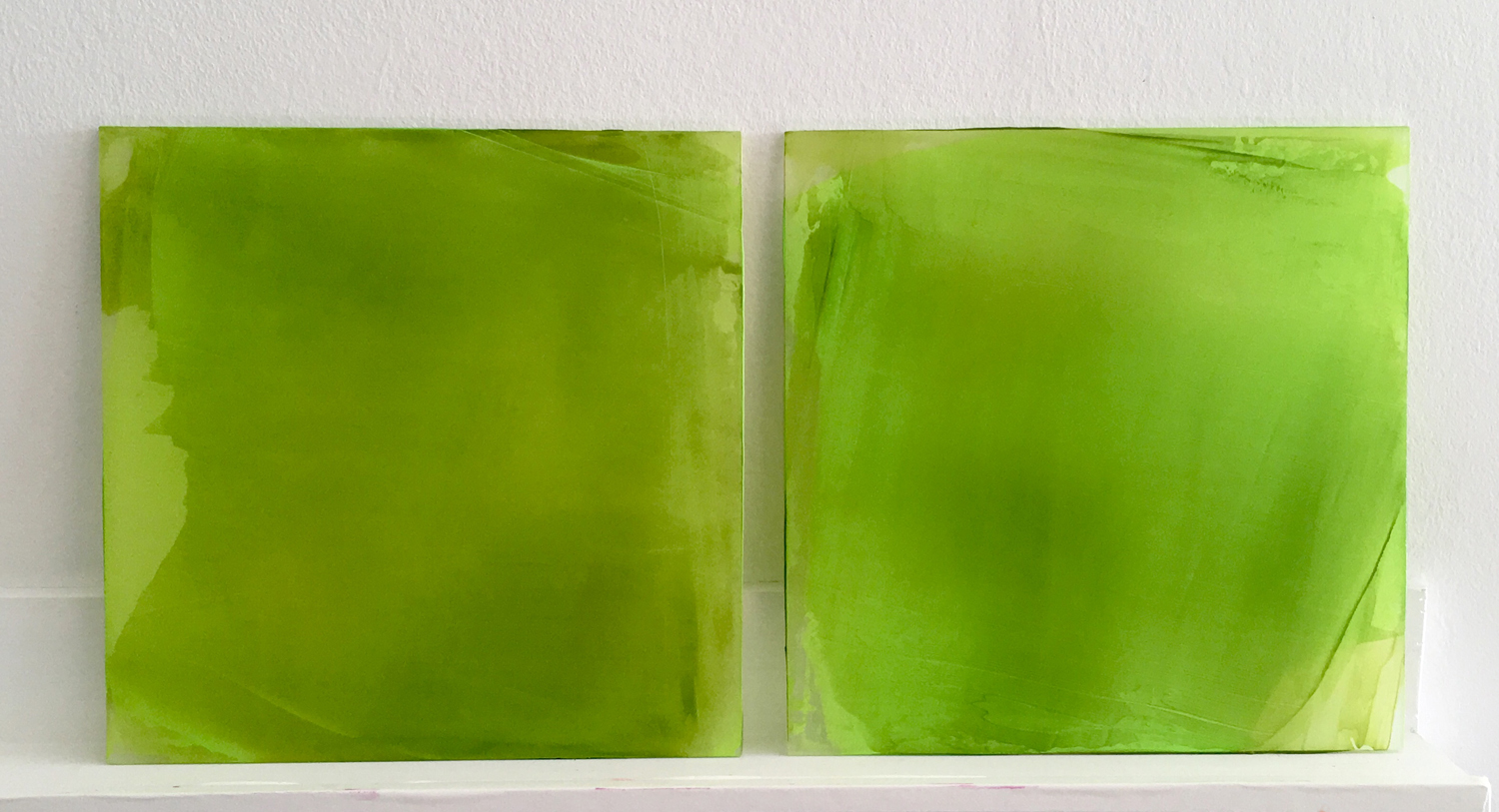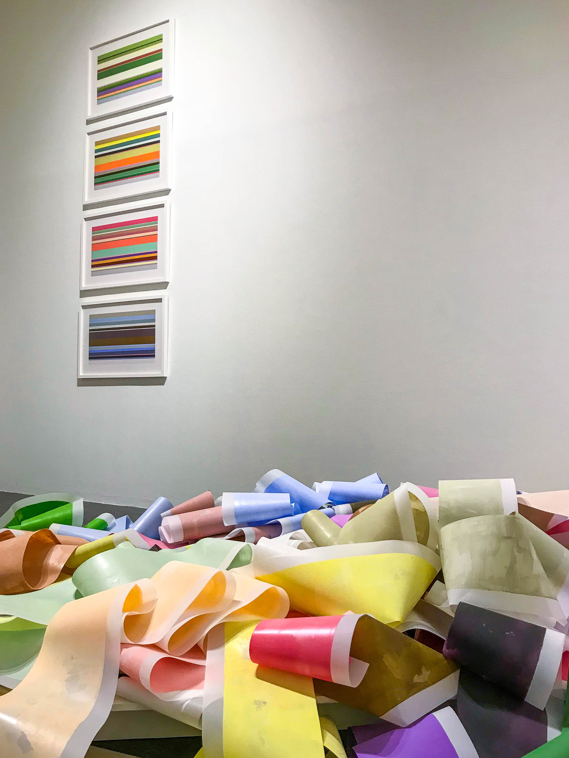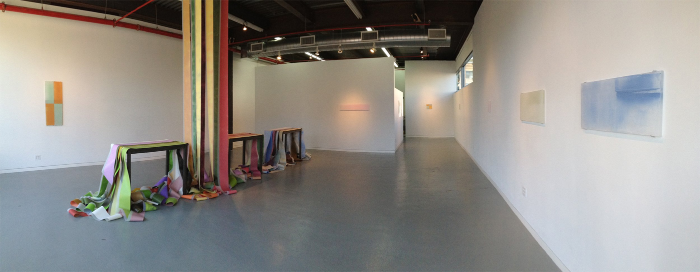 The two-person show Where We Met Ourselves at Yi Gallery’s new space in Brooklyn’s Industry City, features abstract paintings and works on paper by Debra Ramsay and GJ Kimsunken. Both artists share a minimalist sensibility to painting and each of them explores in their own way notions of transcendent spaces through form and color. Although they both use reduced color palettes to create elegant and restrained abstractions which are subtle and luminous, their work is grounded in different traditions.