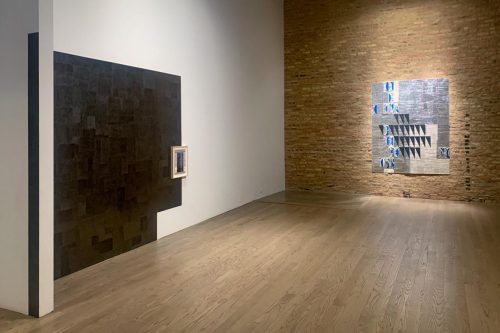 In two side-by-side solo exhibitions by artists Lucas Simões and Dianna Frid, both currently on view at PATRON gallery, the artists appear to pursue possibilities of meaning via symbolic pluralism; however, each artist could stand to learn from the approach of the other. In Luscofusco, Lucas Simões employs the metaphoric notion of twilight, positioned as the moment when light “shifts from presence to absence,” to examine persistent symbols recurrent throughout architectural history and their subsequent phenomenological shifts within unstable temporal contexts. In pre-knowing / un-knowing, Dianna Frid abandons linguistic text in its nominal sense, instead returning in her embroidered canvases to repeating patterns that form a material foundation for legibility – the marks made by the plunging and reemerging of the needle echo the repeating geometric shapes and fragments of Roman characters, allowing pattern itself to suspend the direct relationship between symbol and text. For both artists however, adherence to a dualistic approach to symbol and material, whether limited to form in the work of Simões or “text” in that of Frid, forms an impediment, preventing either from approaching the multiplicitous possibility they seek.