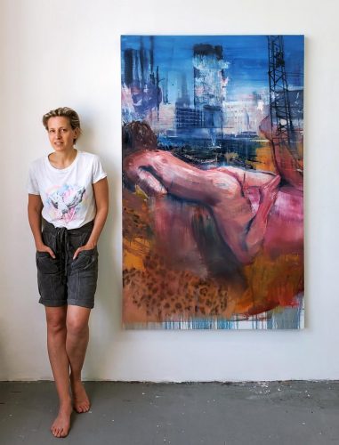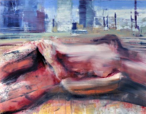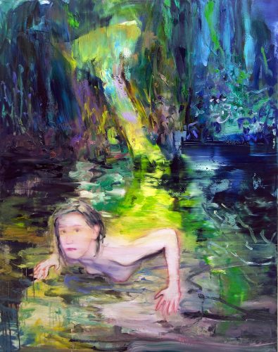 Elena Chesnykh’s paintings at Space 776 depict women in landscapes—the vitality of the body merges with a dynamic natural world into a sensual dance of color and shape, sometimes in reference to harsh current events such as the war in Ukraine. The show, curated by Dasha Bazanova, will be on view from July 22 to August 17, 2022.