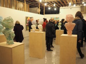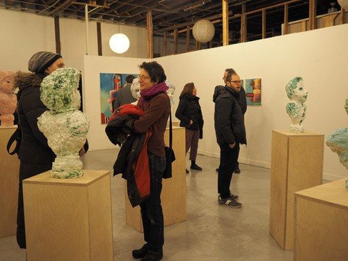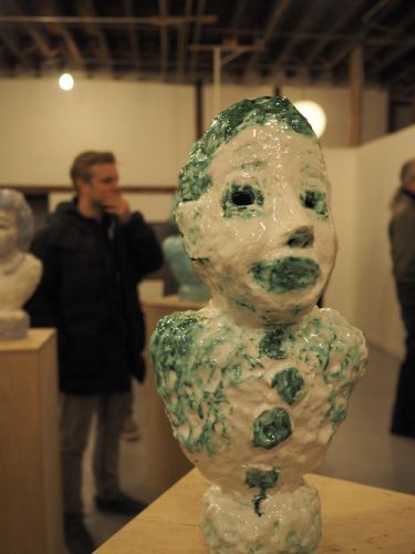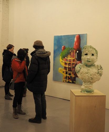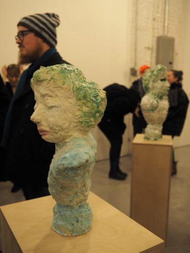 Typically, crowded openings are not an ideal setting for experiencing the artwork on display. Nevertheless, the current show at Storefront Ten Eyck, featuring Elise Siegel’s ceramic busts paired with Mie Yim’s abstracted figure paintings, thrives in a crowded space. As in a theatrical experience or a ritual ceremony, the visitors’ presence enhances the psychological tension that these artworks emit.