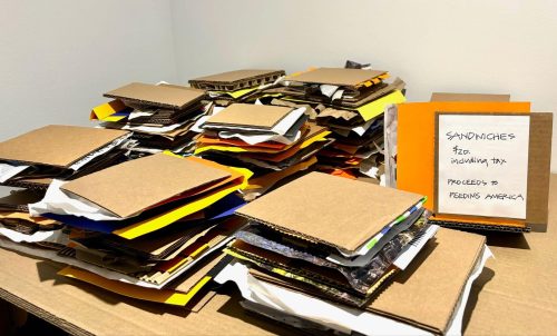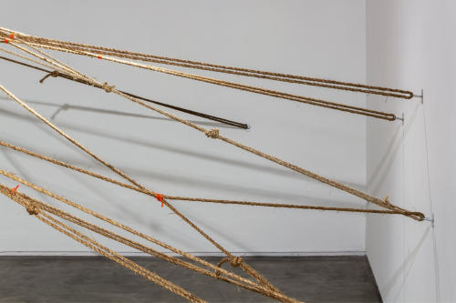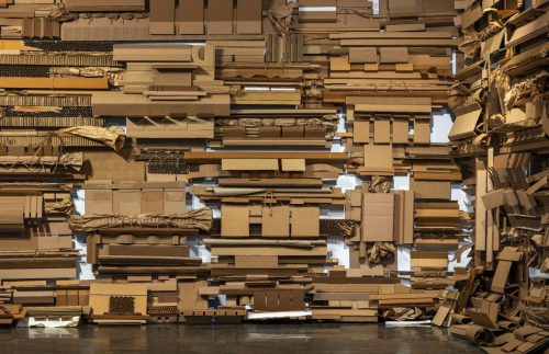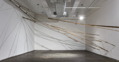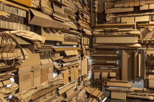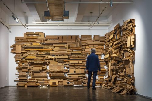 Outcropping, Erica Stoller’s recent solo show at A.I.R. Gallery, which ran through November 10th, utilized cardboard cuttings, formerly boxes, and packaging, as its exclusive material. When walking through the gallery, one noticed the show has three sections– a corner piece that covers two walls, floor to ceiling, a grid of individual cardboard compositions hung on the wall and a third “sandwiches” station that allowed viewers to pick up layered cardboard batches. Proceeds from the sale of the “sandwiches” go to Feeding America. An interesting survey of installation art—a site-specific installation, painting-like works on a wall, and an interactive piece. Stoller often works with space in curious ways. In Item # 25-033, her 2022 solo show at A.I.R. Gallery, she created a single wall-to-wall installation using Manilla rope and elastic bands. The rope cut through the gallery space, creating framed planes between ceiling pipes, wall hooks, and the floor.