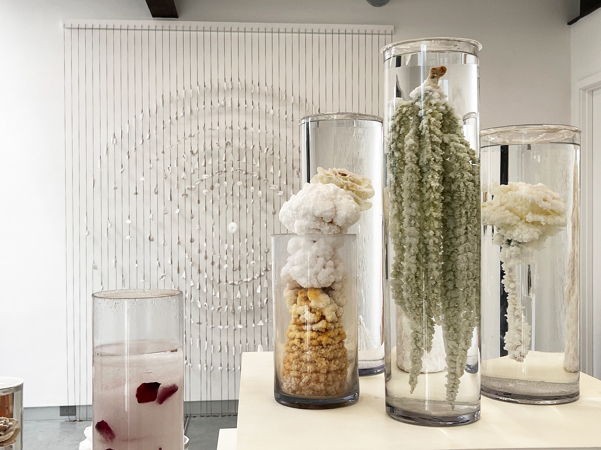 Sparkling surfaces abound in Backscatter, OVERLAP’s quietly radiant summer show of works by Funlola Coker, Katherine Mitchell DiRico, Jesse Kaminsky, Joetta Maue, Leah Piepgras, and Esther Solondz, curated by Alicia Renadette. On a clear summer midmorning, sunshine falls across shimmering layers of glass, crystal, gold leaf, copper, bronze, salt, acrylic, and clear liquid. Materials catch and refract light. The overall effect is of a hushed brilliance that draws you in, inviting a closer look.