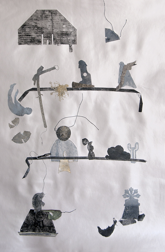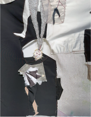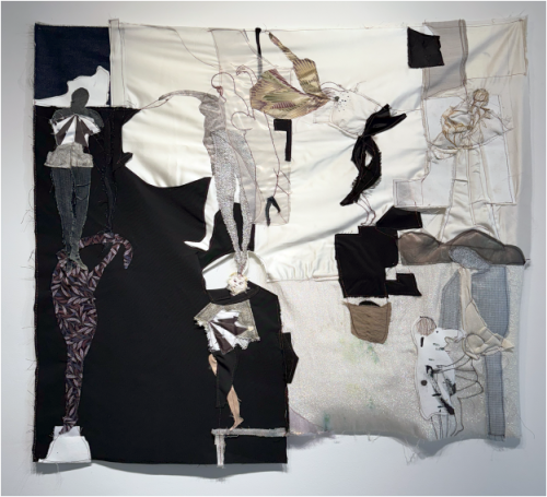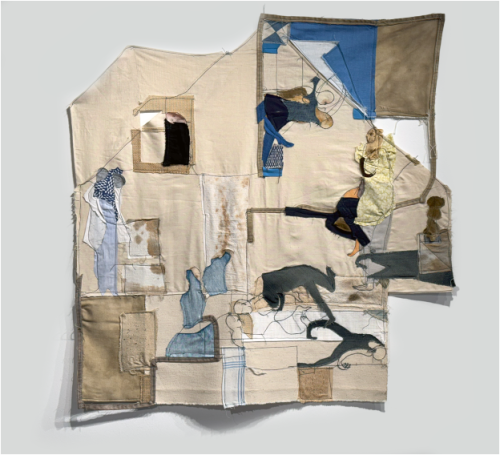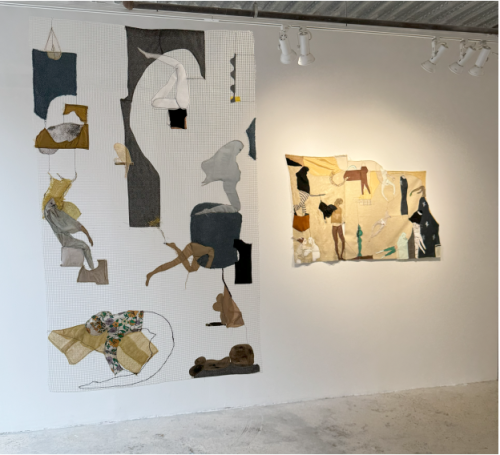 Fanny Allié’s exhibition A Longing at Kaliner presents a series of works made from the materials of daily life. Using worn clothing, domestic linens, and fabric remnants from her own surroundings, Allié constructs layered compositions that speak to human connection, memory, and what remains after use. Her figures, built from these fragments, feel both familiar and distant—suspended in stillness, shaped by lived experience.