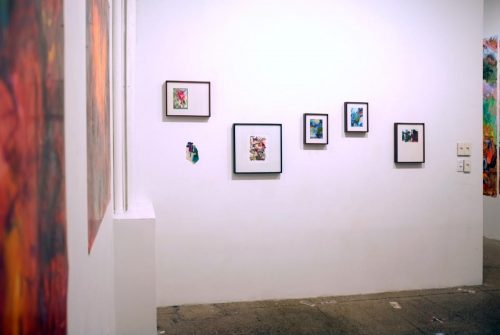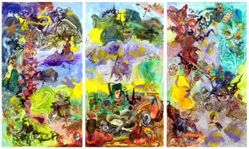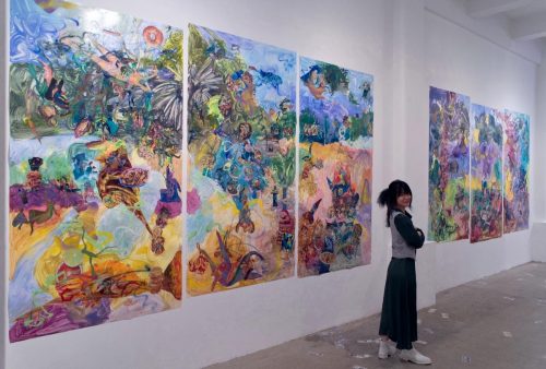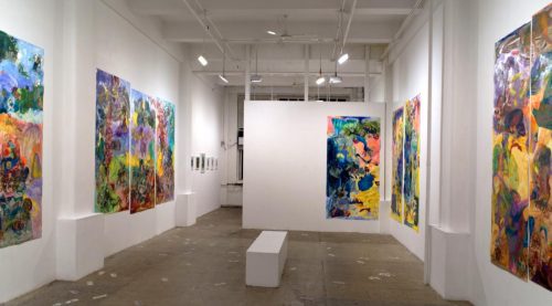 Fei Li’s large-scale paintings in her solo show at First Street Gallery are layered with paint, collaged fragments of dollar bills, magazine cutouts and jetsam of daily life. These visual cues are immersed in vivid yellows, blues, and greens, altogether representing the chaos of our moment. Drawing on a wide array of sources—Chinese calligraphy, pop culture, science fiction, myth, and current events—Li invites us to engage with her own anarchic universe.