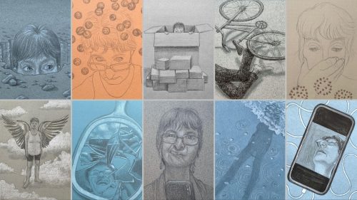 In her solo exhibition at the El Barrio’s Artspace PS109 in Harlem, NYC based artist Fran Beallor shows every one of the 366 self portraits she created in 2020. While drawing a new self portrait each day, a number of sub-series organically emerged, on themes such as the iPhone, Boxes, Gravity, and Shadows. Each brings forth a distinct angle of the pandemic experience. Fran Beallor says, “I make self-portraits to see and interpret my world.”