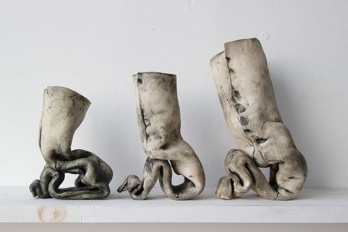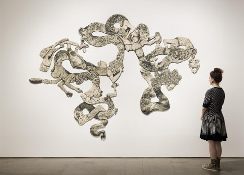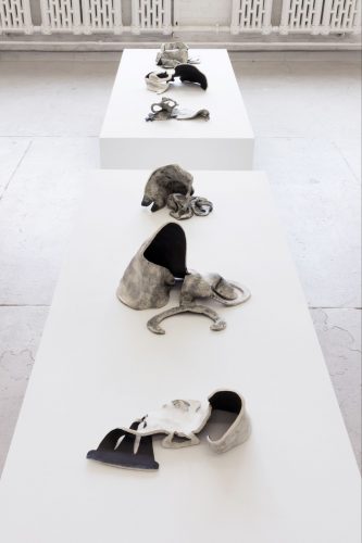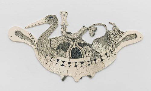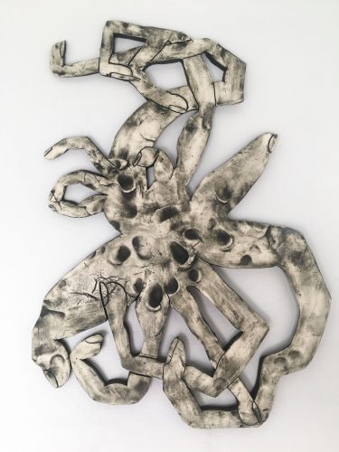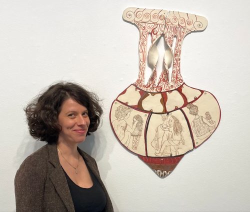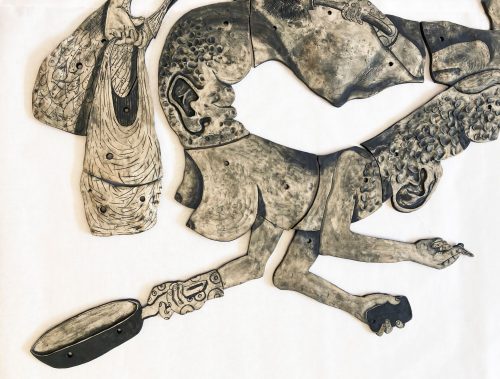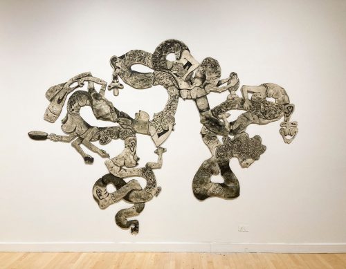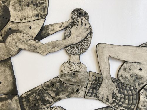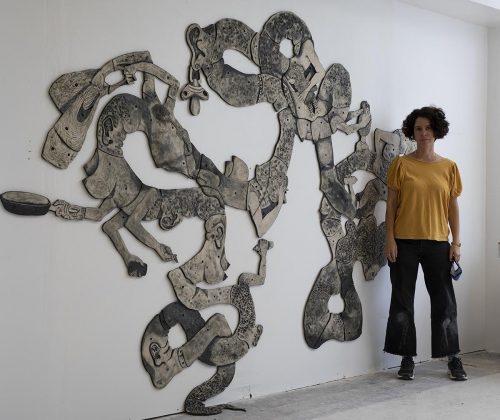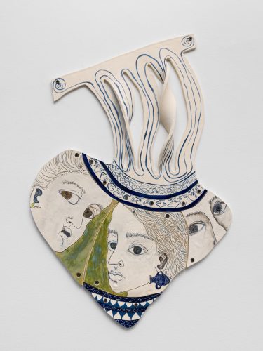 In her solo exhibition at Asya Geisberg Gallery Gabriela Vainsencher exhibits wall hanging porcelain reliefs, referencing the nuts and bolts of motherhood entangled in layers of epic mythological context—Medusa reveals a worried woman with a frying pan and a baby’s pacifier as weapons at hand. The show runs through April 8th, 2023.