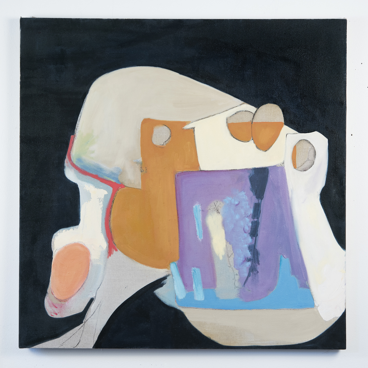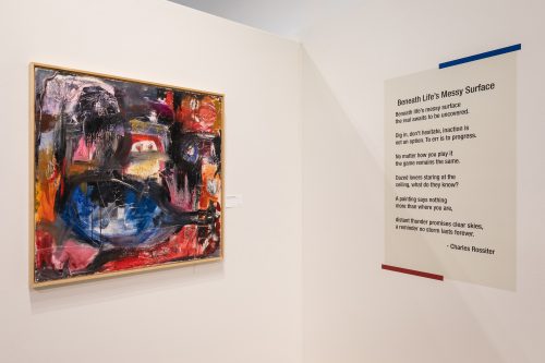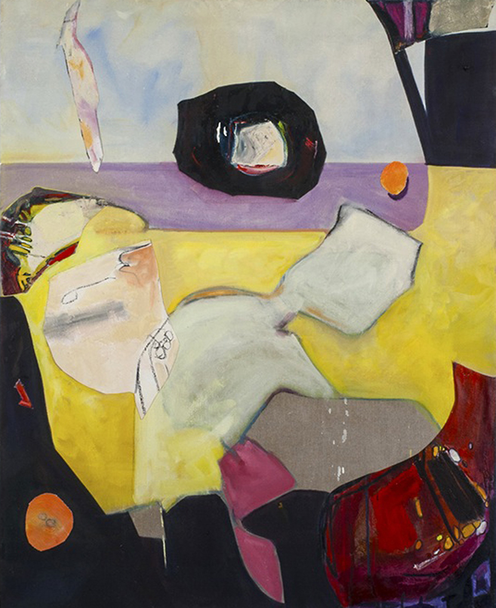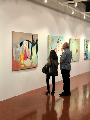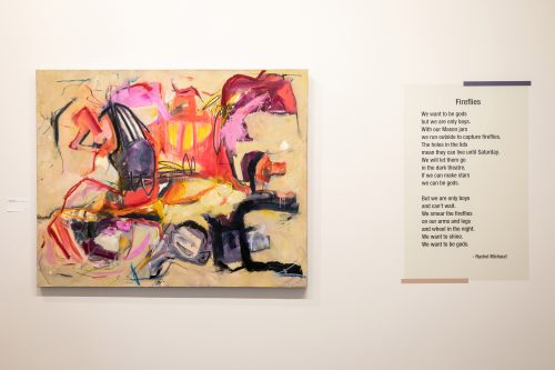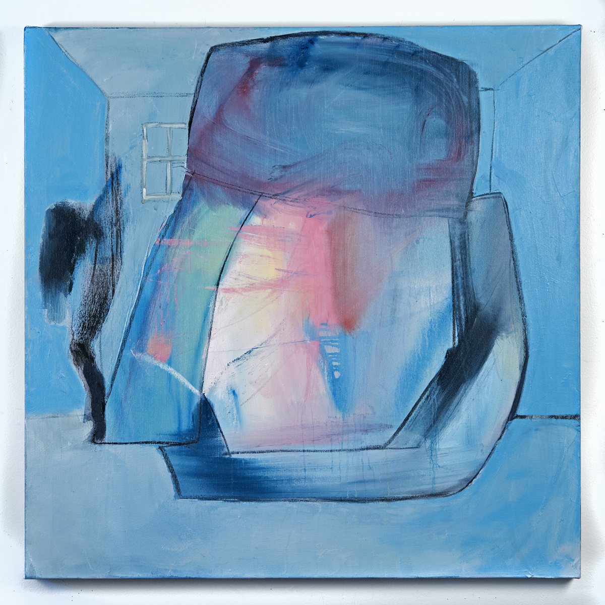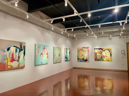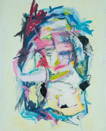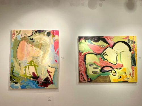 Silence Breaking is a hidden gem of a show featuring abstract paintings by Gail Winbury at the Carl and Helen Burger Gallery on Kean University’s idyllic, park-like campus in Union, NJ. A New Jersey native, Gail Winbury’s oil paintings depict interpretations of various poems and personal stories that manifest into abstractions with colliding shapes and colors. Her use of gestural abstraction and expressionist lines reflect her interest in the elicitation of psychological responses via painting. Most of the work in the gallery is in large square format, dominated by celadon or mint blue green – a color frequently ranked among the calmest colors. The Field of Green series, which is most of the show, is a departure for the artist, whose previous series had much more aggressive lines and brighter shapes, which more comfortably rested into a traditional rectangular surface dimension. The compositional choices in this body of work are deliberate and minimal, reflecting a more meditative feel full of cooler tones and calmer transitions.