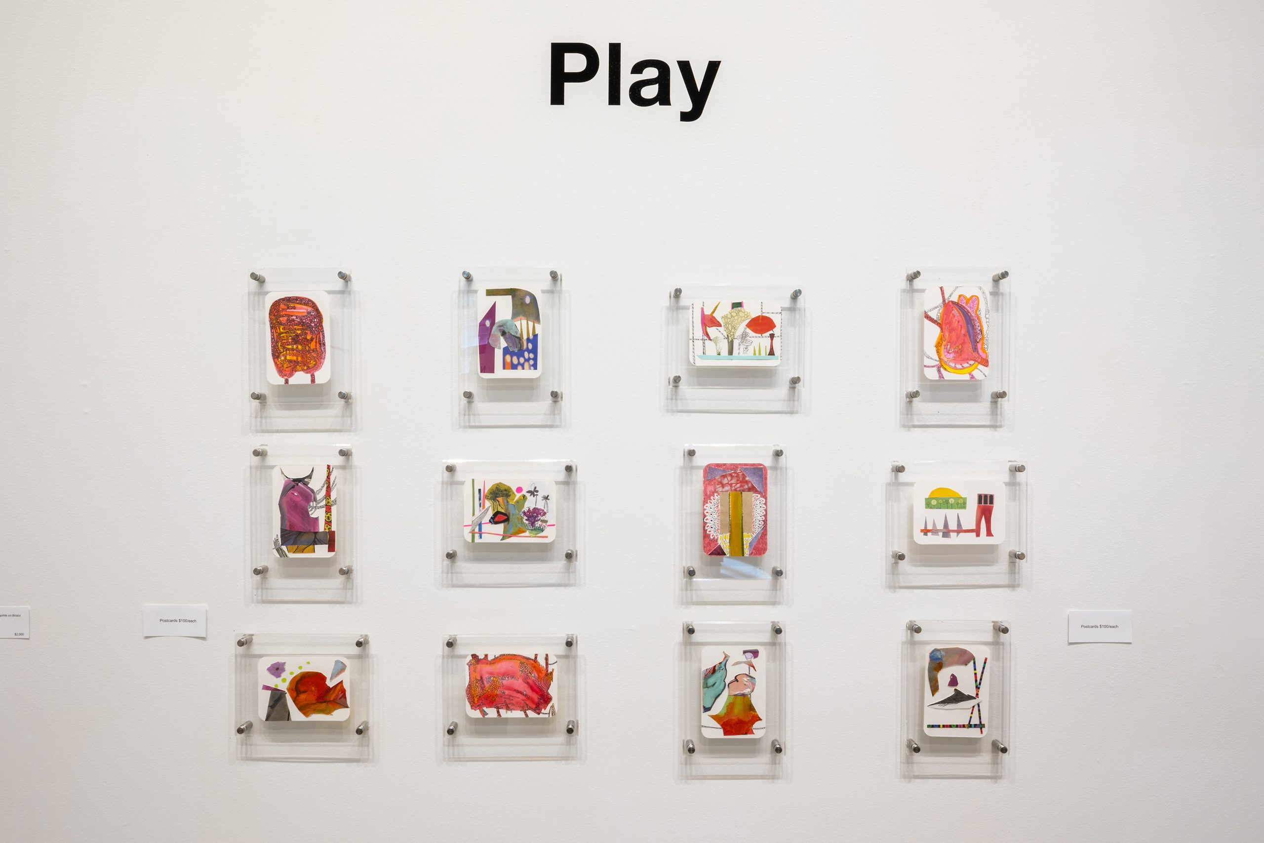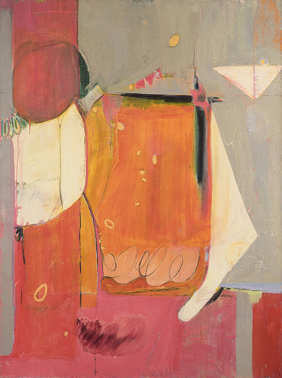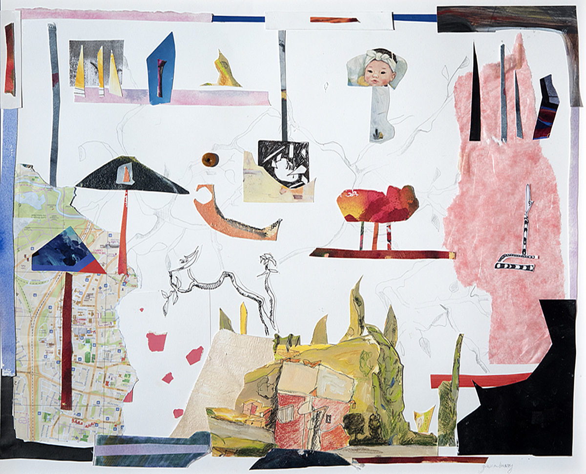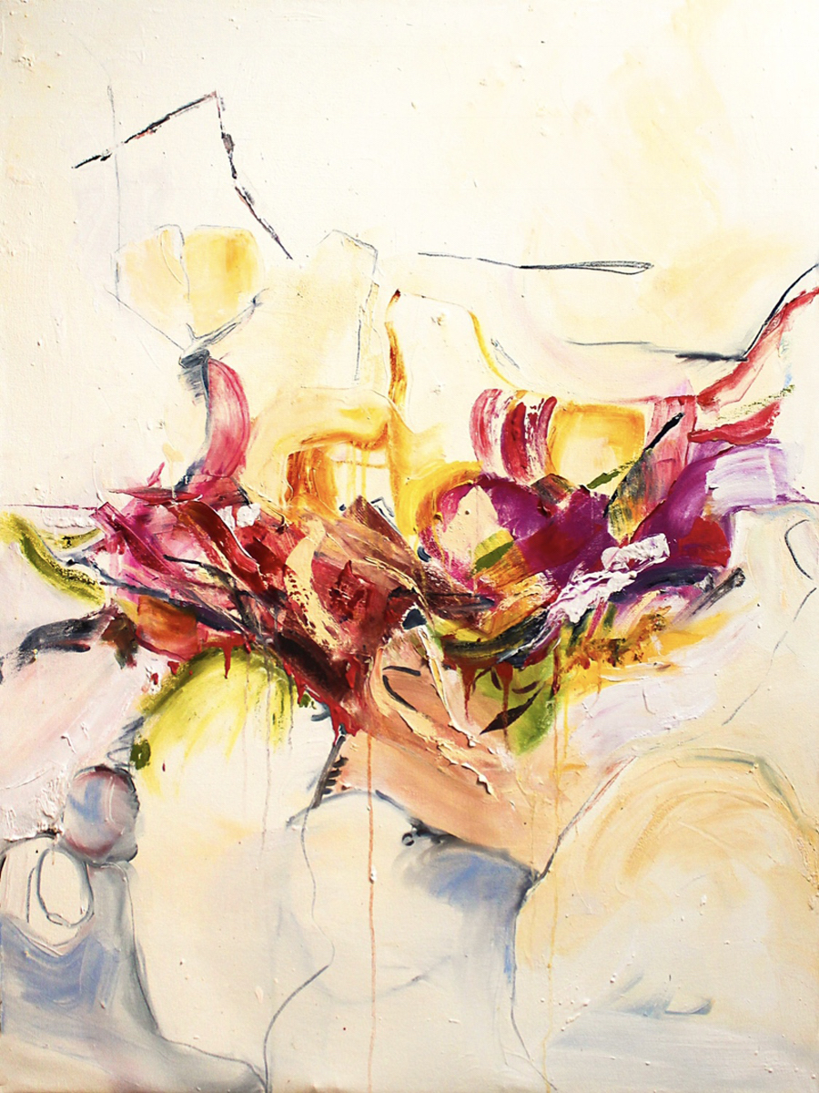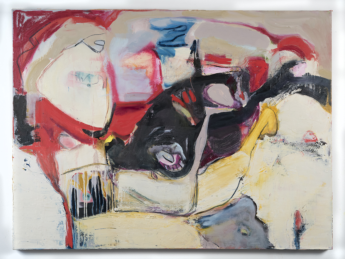 Silence Breaking is a hidden gem of a show featuring abstract paintings by Gail Winbury at the Carl and Helen Burger Gallery on Kean University’s idyllic, park-like campus in Union, NJ. A New Jersey native, Gail Winbury’s oil paintings depict interpretations of various poems and personal stories that manifest into abstractions with colliding shapes and colors. Her use of gestural abstraction and expressionist lines reflect her interest in the elicitation of psychological responses via painting. Most of the work in the gallery is in large square format, dominated by celadon or mint blue green – a color frequently ranked among the calmest colors. The Field of Green series, which is most of the show, is a departure for the artist, whose previous series had much more aggressive lines and brighter shapes, which more comfortably rested into a traditional rectangular surface dimension. The compositional choices in this body of work are deliberate and minimal, reflecting a more meditative feel full of cooler tones and calmer transitions.