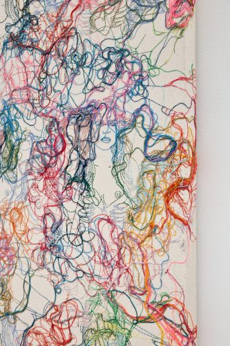 Upon entering this exhibition, I was taken to the wall pieces immediately, especially the use of vibrantly colored embroidery string mimicking paint strokes on the canvas. Art historical references and connections are very prevalent in the works of this exhibit. It was refreshing to see this conversation of the painting canon being brought up in a contemporary light by the use of this novel medium. Amer’s love and interest in the history of painting is apparent, and her works show art historical influences intertwined with intuition and a strong painterly hand that is present despite there being no paint in the show.