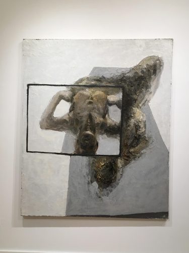 The work in “New Narrative Now,” curated by Michael David and Martin Dull at M David & Co. is united by a particularly muscular and aggressive kind of paint handling – unsurprising from a gallery well-known for cultivating abstract expressionist work. The paintings also share lyrical and mythical storytelling qualities. Recognizable figures flicker and bend across these canvases, wading through turgid waters, or wrestling with ropes of paint, or bathing in dreamy color. Animals and toys crowd some canvases, women stretch tortured forms across others.  Personal mythologies illuminate and infuse each canvas, casting a mysterious spell for the viewer.