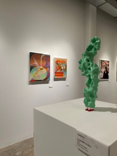 This group exhibition at the IW Gallery brings together a wide array of artists, visions, and mediums. Each of the eighteen artists in the show is connected in some way, whether it be from Pratt Institute, they are former international students who have decided to stay and continue making work, all the way to friends and former classmates. This grouping is an eclectic amalgam of stories and inspirations that diverge in their own ways and reconverge to create new conversations. Many of the artists in this exhibition use their work to embody their stories, memories, and histories. Pieces of their lineages, carrying across various places to join together in one location starting an ever expanding dialogue with each other.
