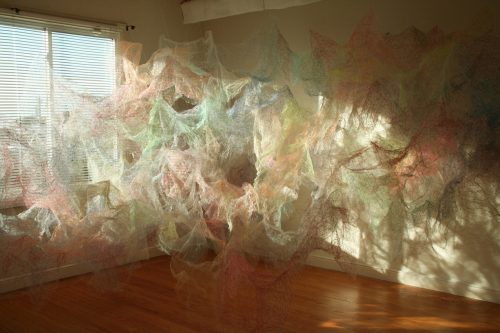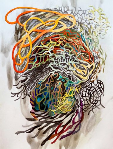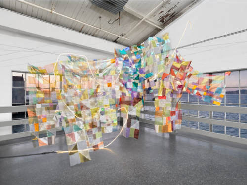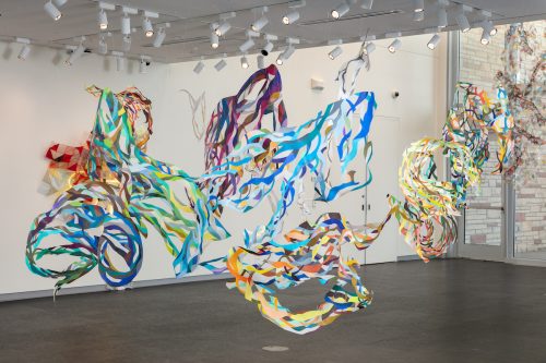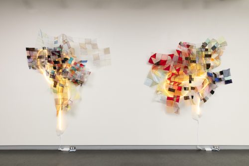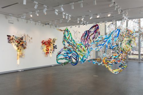 “Coming full circle and making whole” is how Holly Wong describes her process of repair—working with memory, reassembling fragments, and layering paint, fabric, and light into new forms. On view at SLATE Contemporary in Oakland from September 5 through October 11, 2025, Full Circle is her second solo exhibition with the gallery. It brings together collaged paintings on shaped aluminum and wood panels, mixed media drawings, wall-based fiber and LED installations, and a heat-molded acrylic assemblage, presenting a mid-career survey of her work.