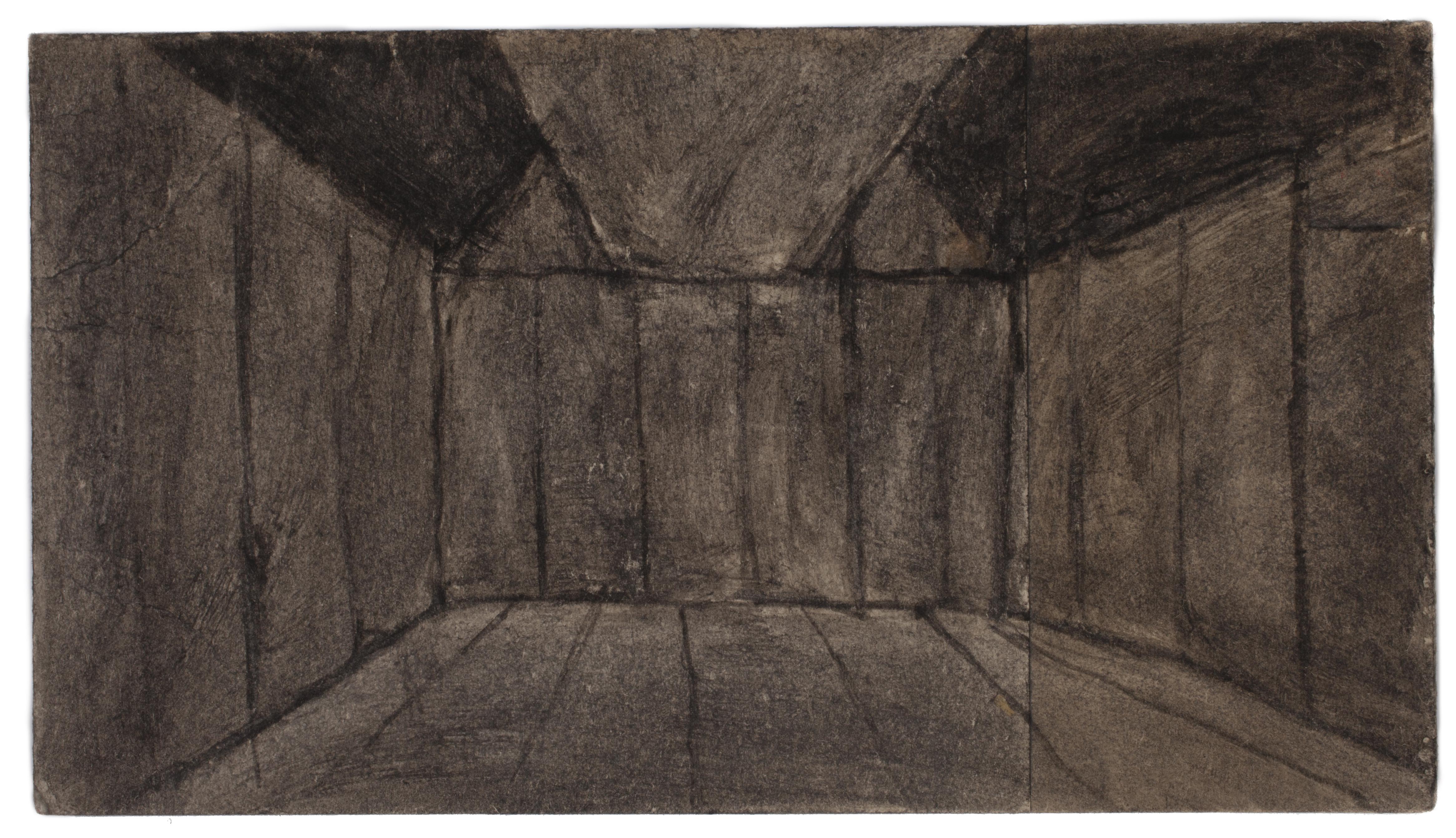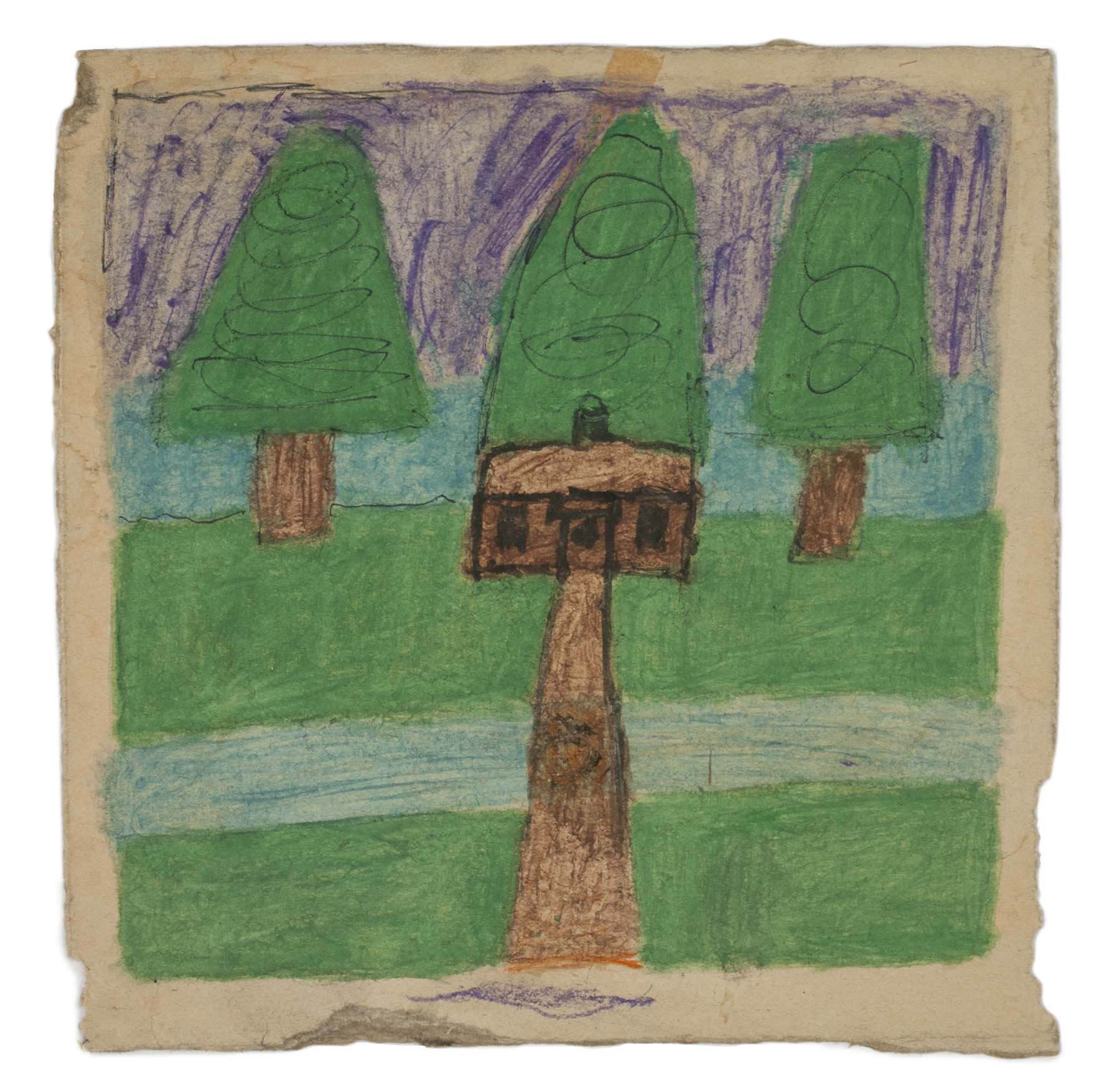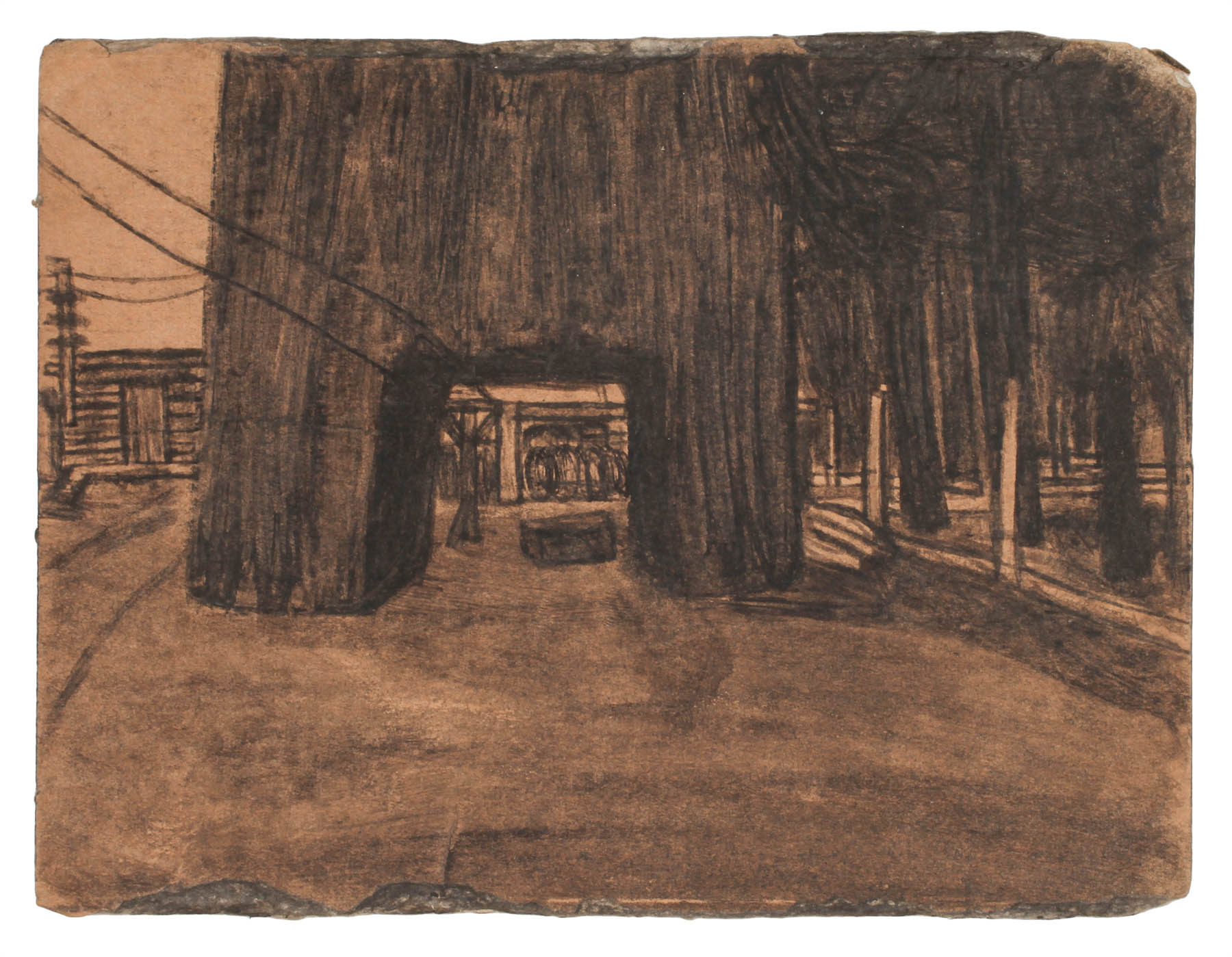 [caption id="attachment_304" align="aligncenter" width="500"] James Castle (1899-1977), Untitled (drive-through tree), n.d. Found paper, soot, 5 7/8 x 7 3/4 in. CAS09-0179