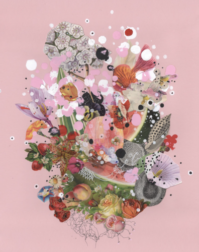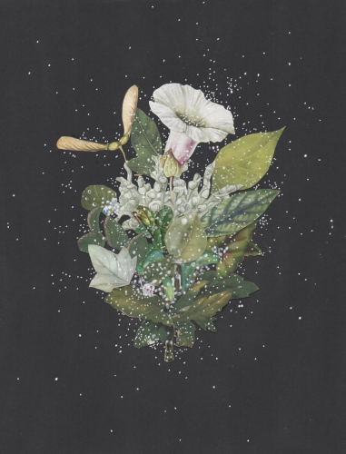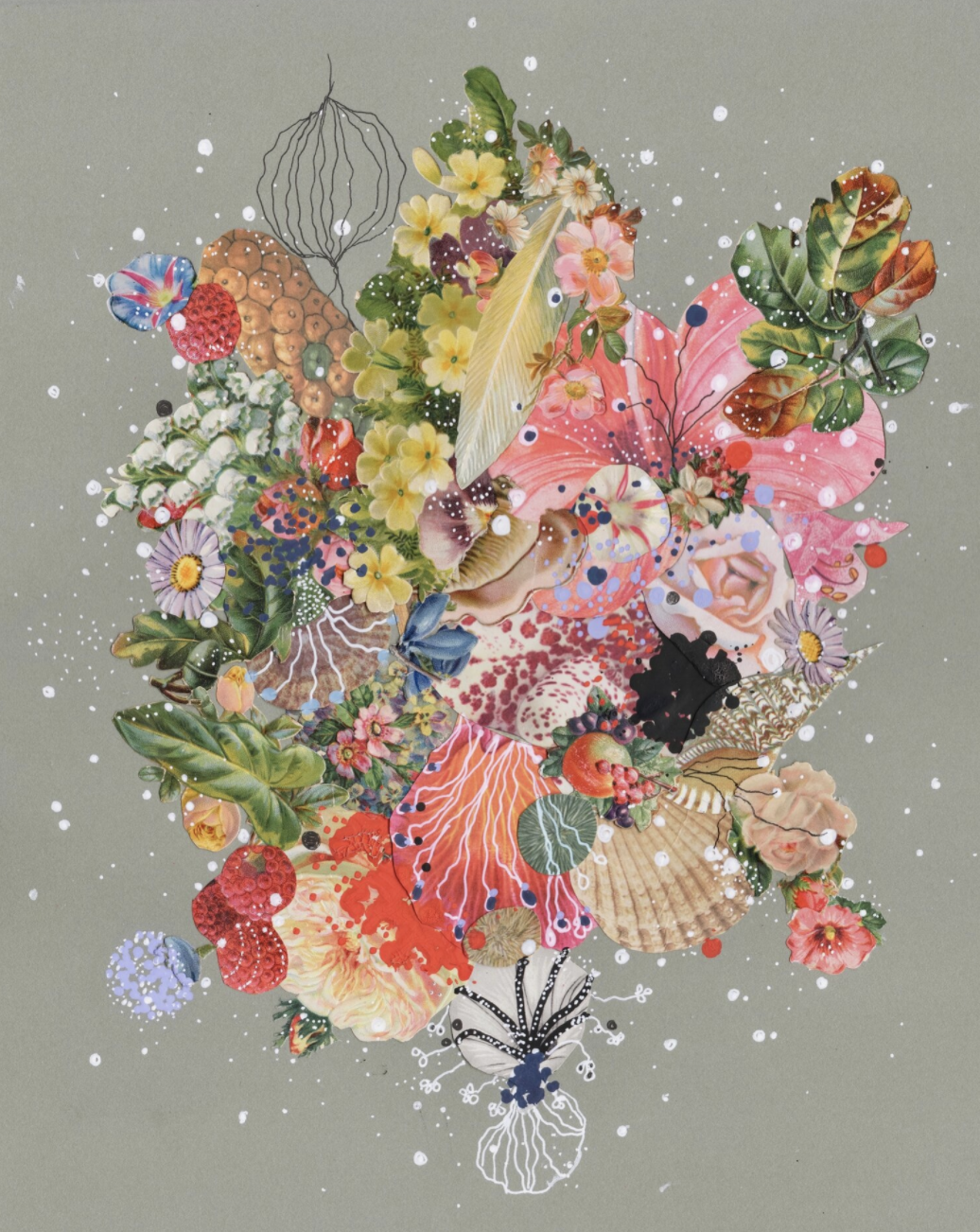 Providence-based artist Jenny Brown’s mixed media collages and drawings visually present the viewer with her imagined visions of an alternate universe in which the sublime beauty of nature is heightened. She layers vintage photographs, sketchbook drawings, and other paper ephemera of plants and sea flowers, adding delicate linework and speckled marks with ink to create maximalist compositions that invite one to question if how we perceive our own natural world is indeed limited. The artist’s fascination with our current understanding of how time, space, energy, and matter intersect largely informs her art and the process of creating itself.