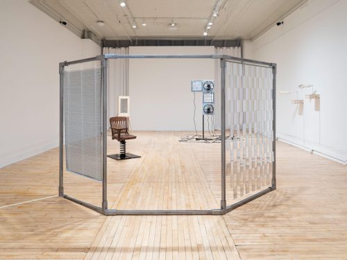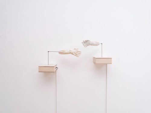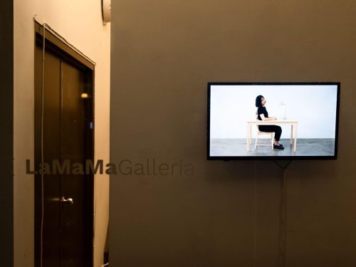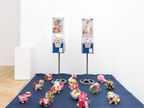 Jiwon Rhie often explores moments of deep personal depression, social misanthropy, and cultural alienation in her work. You would never know it, though, from first viewing. Walking into La Mama Galleria in the East Village, NY, visitors are greeted by the playful whirring sound of over a dozen mechanical toy dogs, each covered in exploding layers of colorful, fake flowers. The dogs walk across a blue moving pad, bumping into walls, each other, or the artificial boundaries Rhie erected. In the center of the moving pad, two quarter candy vending dispensers shake with the motion of encased and enflowered toys, which act, of course, unperturbed by their enclosures. Viewers are invited to borrow quarters from the gallery to dispense pods filled with custom keychains and temporary tattoos from the candy machines. Though only a corner of a room within a larger exhibition, Rhie’s Flower Dogs make it impossible to enter the gallery without stopping to smile, take a photo or video, and procure ones own custom keychain art.
