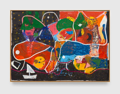 The ten paintings in Vom Abend, Joe Bradley’s current show at David Zwirner, measure up to 93 x 120 inches and are all dated 2023-2024. They are big and, with one exception, are in landscape orientations. Framed with white oak strips, they have stately feel, yet they are hardly genteel. They are full of crusty skins of dry paint that seem randomly attached to the surfaces. They are creased and folded. They reek of oil paint. And while the color is buoyant, joyous even, they are also dark. Bradley isn’t afraid of black, and he explores shit brown with an alarming gusto. There are passages where the paint seems to have been aggressively ripped off the surface of the canvas, only to be tenderly painted over again. There are staccato stippling marks. There is erasure and heavy impasto in stretches. Although this may sound like the paintings are heavily labored and full of themselves, they aren’t. And careful examination reveals worlds to explore.