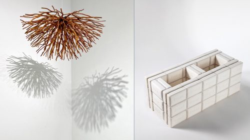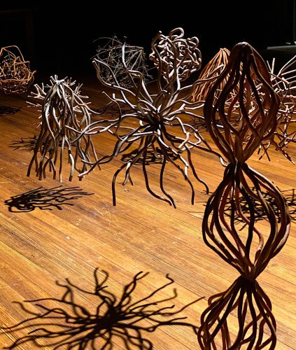 In Jon Bunge’s exhibition, Presence, at the Bonsack Gallery of John Burroughs School in St. Louis, Missouri, 23 sculptures, moving and turning in invisible air currents, appear to float inches above a hardwood floor. Made from the branches of trees, they evoke both a sense of mystery and a clear expression of the universe’s forces. Eight more works are included in a display case outside of the installation.