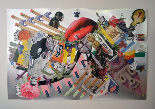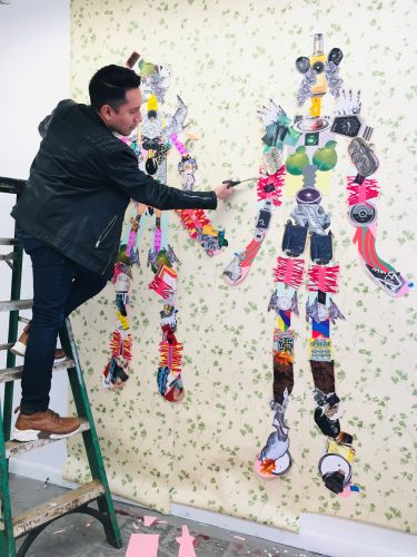 New York based artist Juan Hinojosa collects found objects from everywhere he passes by. A toy snake, a wooden bird, a Good Luck charm, fragments from advertisements and billboards—find their way into his intricate compositions, creating altogether layered sculptural assemblages and intricate two dimensional collages. In both dimensional and flat formats, Hinojosa’s vocabulary is grounded in Pop aesthetics with a tint of Surrealism. Through super vivid colors and elaborate graphic shapes he depicts imaginary worlds where extravagant shrines and hybrid flowery creatures become a convincing presence. When you get closer, you can most likely trace where they came from.