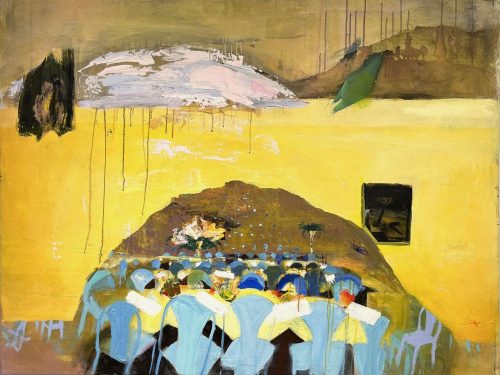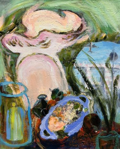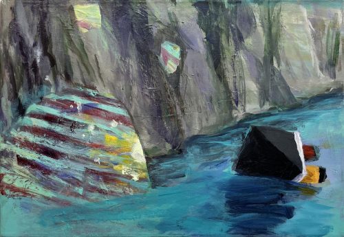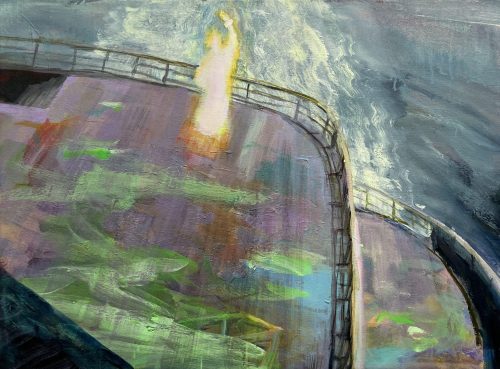 Judith Simonian’s solo show at JJ Murphy Gallery, poignantly titled The Human Element, Huddled and Still, features her latest paintings from the past few years. At first glance, there is familiarity in each piece – a living room, a still life, part of a ship – but as one starts to look closer, something starts to happen. Within each painting, there is a portal into another world; there are clashing planes and changing scenes that are so seamlessly blended together the viewer’s brain needs some time to catch up. What is particularly astounding about Simonian’s work is that her subject matter is a humble amalgamation of scenes, spaces, and objects one would encounter in everyday life.