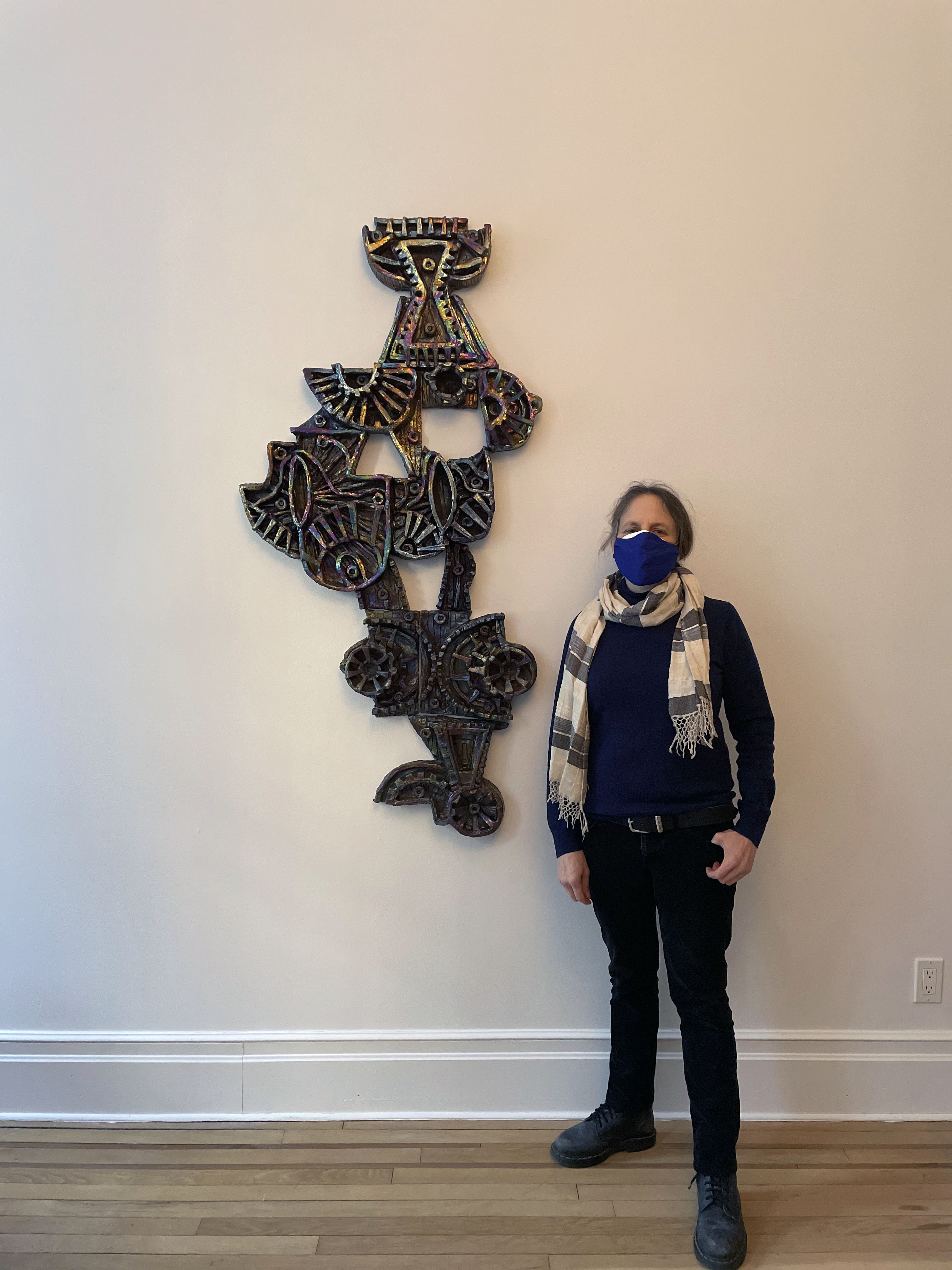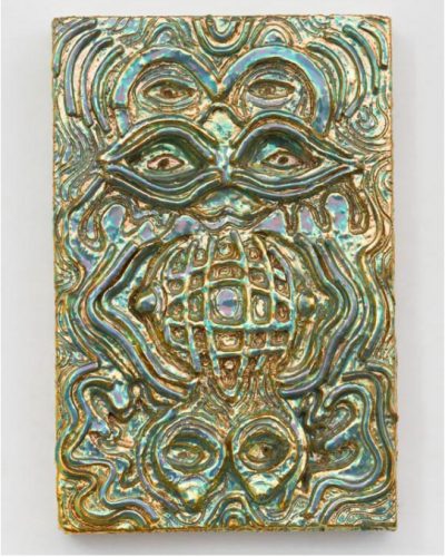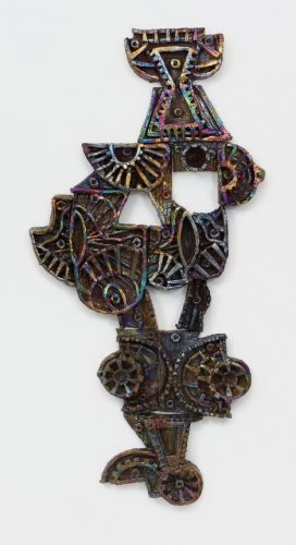 Running through March 4rd, Julia Kunin’s exhibition Mechanical Ballet at Kate Werble Gallery features ceramic wall reliefs and caryatids that create an imaginary narrative of sexually charged figures. “They are at once fortresses in themselves, a merging of body, machine and architecture, ready to become weaponized,” the artist says. The works draw from the hard-edged geometric rhythm found in Art Deco objects and the relentless patterns pay tribute to Art Nouveau and Op-Art. Her most recent large wall pieces are made up of multiple sections, with the potential to be re-arranged and taken apart. Julia Kunin refers to them as sculptural drawings in clay, that vibrate with iridescence — “the destabilizing psychedelic color enables the figures to change and move in their ever-shifting narrative frieze,” she says.