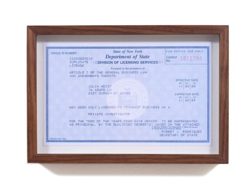 Julia Weist’s new exhibition Private Eye, currently on view at Moskowitz Bayse in LA, blends artistic practice with journalistic research to investigate how big data operates in America. In 2021, companies in the United States spent over $110 billion on big data. Weist’s work taps directly into this massive industry, which buys and sells our personal information without consent.