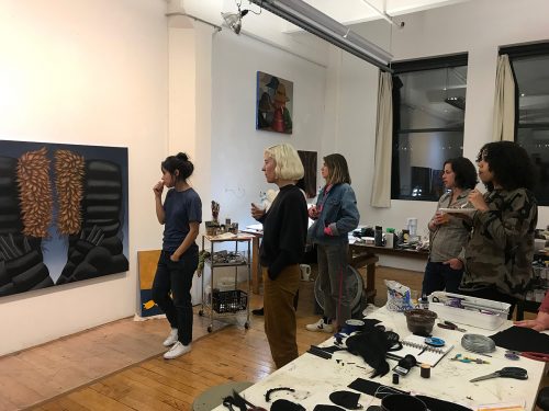 The roots of a tuft of wild grass pulled up from the ground form an intriguing network of living fibers, interlaced with earth. This tenacious nest is a fitting visual for the perennial phenomena of women’s grass roots art collectives found around the world. Springing forth in the ‘70s collectives such as SOHO20, Artemisia, Women’s Building, Guerilla Girls, Las Damas de Arte, and WARM have provided support and opportunities for women not otherwise readily available in the staunchly patriarchic art world. In the subsequent decades women’s art collectives have proven to be a fertile, popular and diverse multi-purpose force, although unfortunately mainstream institutions have under-acknowledged their impact. Art Historian Kathleen Wentrack, PhD, observes, “[The] numerous exhibitions devoted to feminist art in the last decade or so [devote] little attention to collectives, and [there is] a lack of historical studies of collectives and their influence on contemporary art practices, which continue to be influential to the present day.” This exhibition, “Slečny od maliarskeho stojana,” which translates as “Ladies of the Easel,” presents an opportunity to document the origins of a thriving women’s art collective called LP (formerly known as Lady Painters) founded in 2015 by Jenn Dierdorf and Kelsey Shwetz in Brooklyn, NY. When conceiving of the show, curator Juliana Mrvová used LP as a resource for selecting work. Paintings by Dierdorf and Shwetz, among others, are included in the exhibition, which is presented from June to November 2019 in four cities in Slovikia: Bratislava (the capital), Banská Bystrica, Trebišov and Rimavská Sobota. As an early and on-going member of LP, I’m pleased to have the opportunity to interview Dierdorf and Shwetz about their motives and goals for the LP collective.