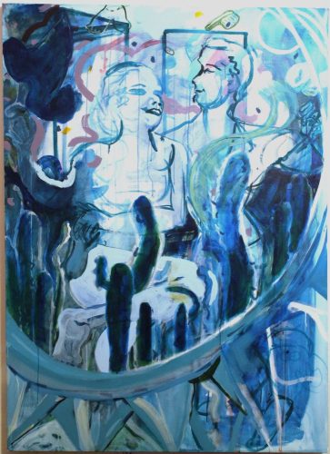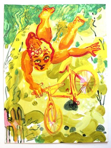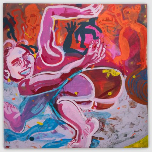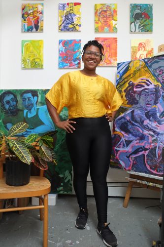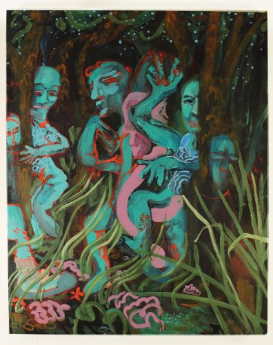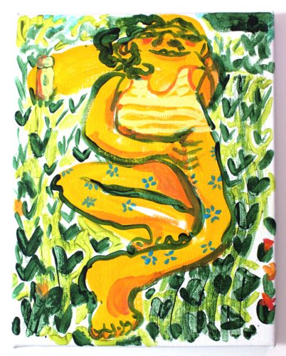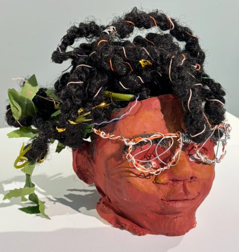 Recenter is a delightful return to Impressionism in many ways. Prioleau-Martin chooses for her subject matter decidedly impressionistic themes—moments at home, moments of introspection, and unrehearsed tenderness, all the casual yet poignant subject matter that marked painting’s initial move from the historic and fantastical to the everyday and human in the 1870s. She also employs the paint with a focus to capture the spur of the moment and the unexpected. Her small-scale ceramics, composed on the templates of stock sculptural types—odalisques, Rodin-like romantic poses, and busts, are, by virtue of their Lilliputian size and wit, Impressionist re-interpretations of dry classic forms. They start out as one thing and shift mid-stream into another: this is particularly evident in Prioleau-Martin’s bust Self-portrait (2024) which masquerades as a planter with fabric and wire vegetal tendrils emanating from her cranium along with her braids.