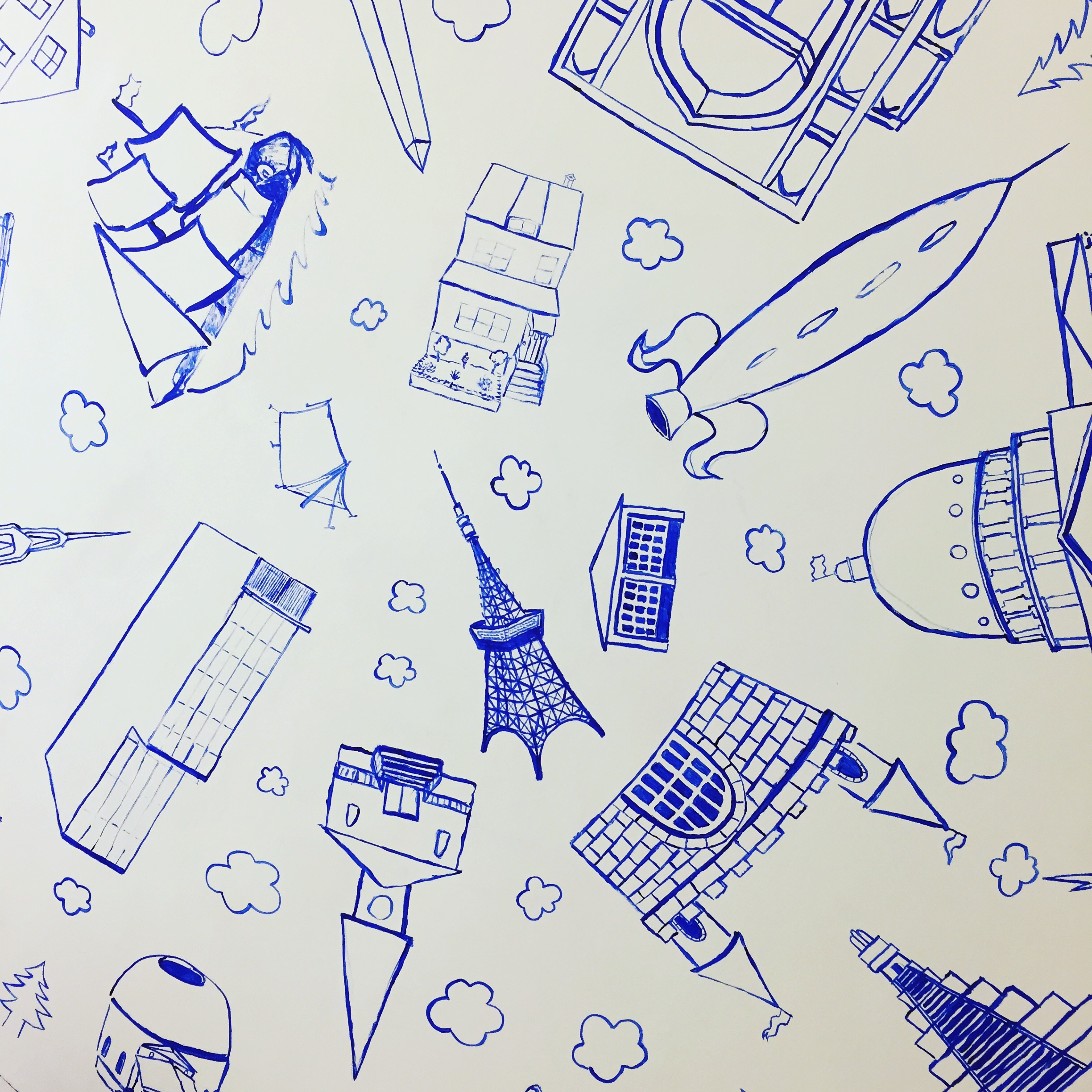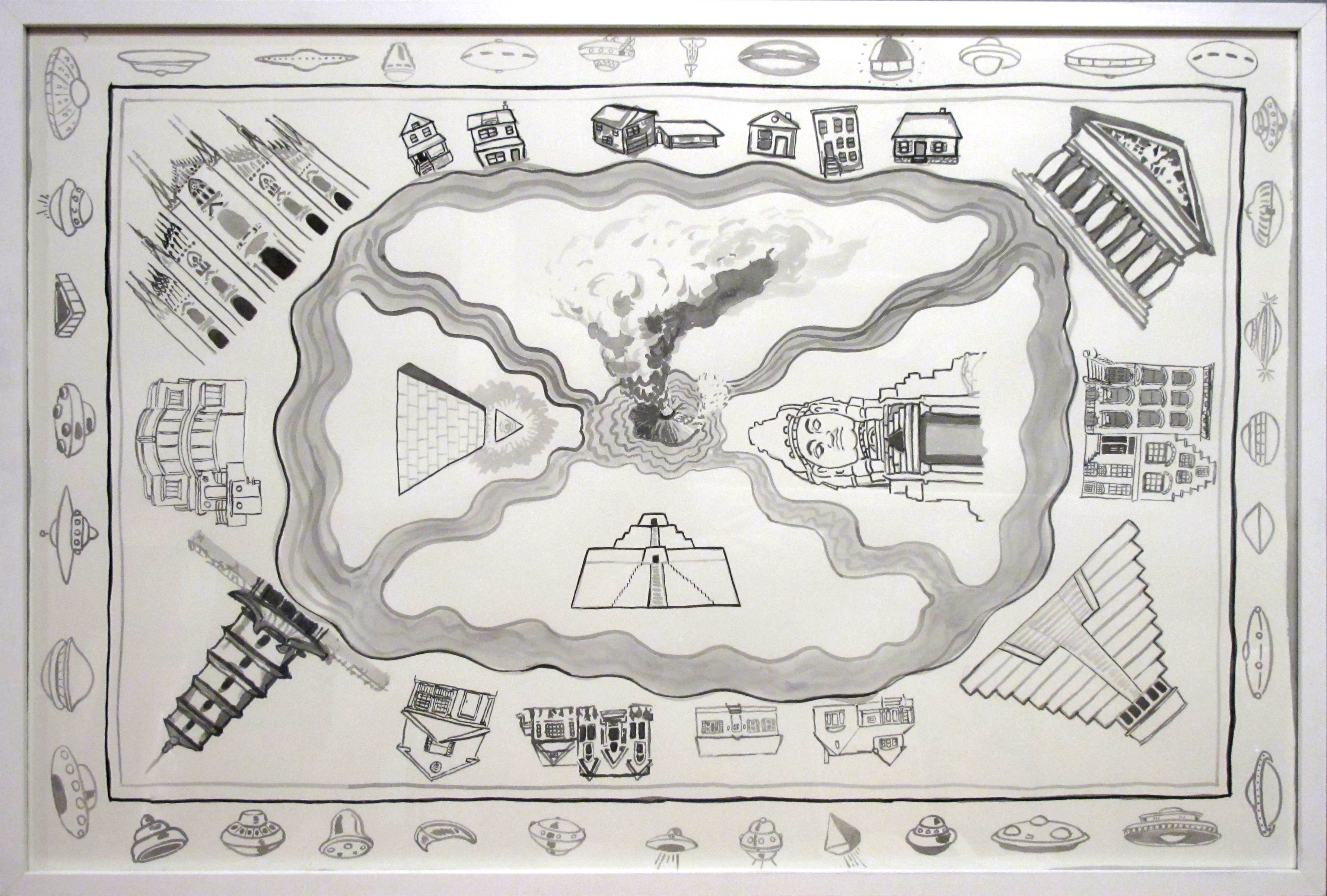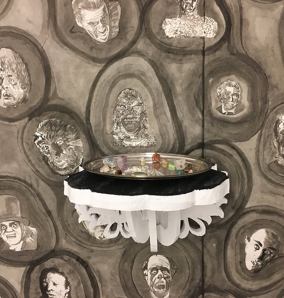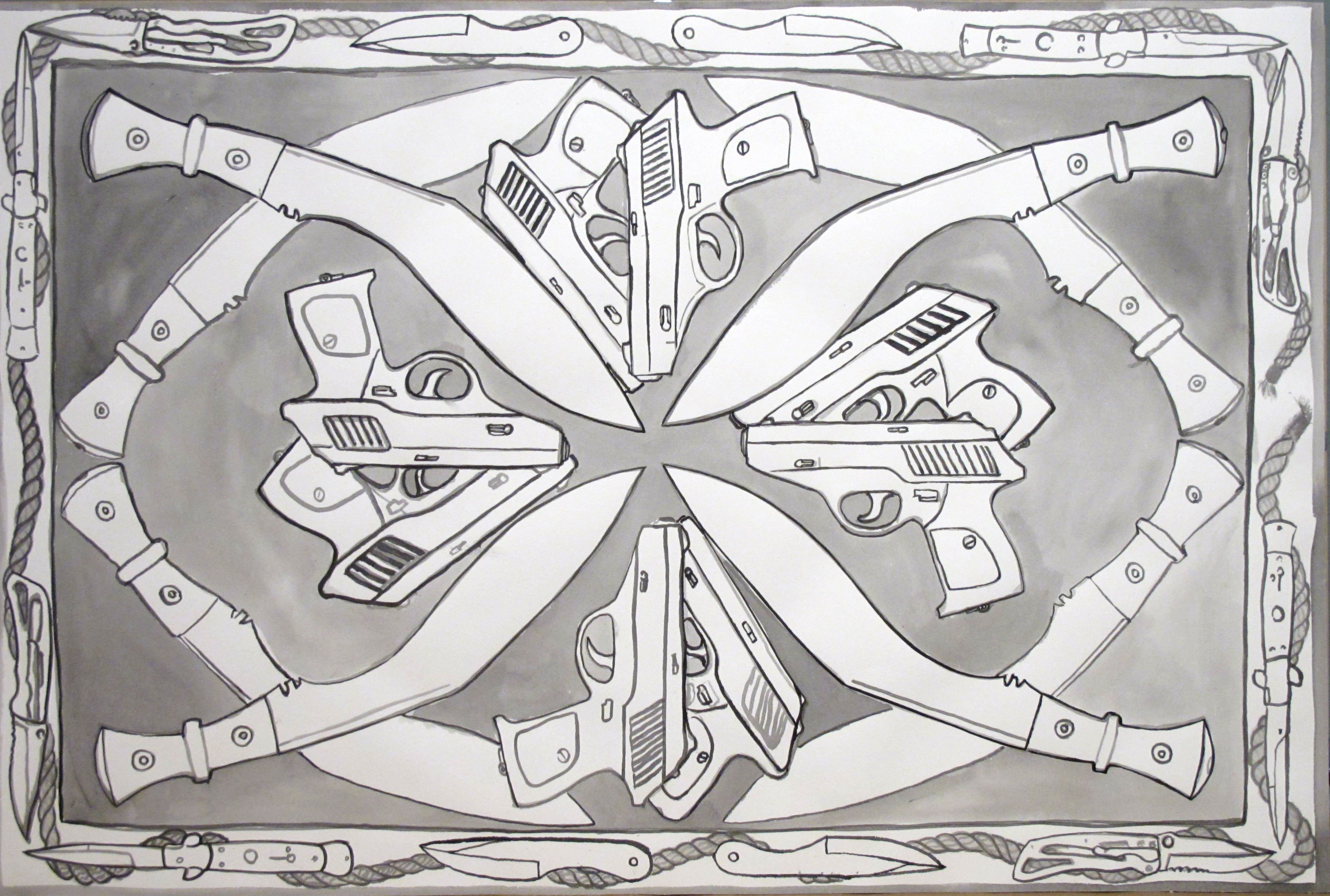 In his exhibition at Norte Maar Cypress Hills gallery, Kevin Curran uses interior design elements as a departure point for an installation – combining wallpaper, rugs, vases, framed works on paper, wall-mounted and free standing sculptures. His surfaces merge opulent materials like crystals and gold leaf, with rough-hewn casual aesthetic. This exhibition includes drawings that refer to Afghan war rugs as well as political tensions in the US. The symmetry of rug design paired with natural and man made forces of destruction highlights the fine line between an orderly society and chaos. The imagery brings together a little boy’s enthusiasm for rockets, trucks and guns with the perspective of an adult’s anxiety driven by real world events.