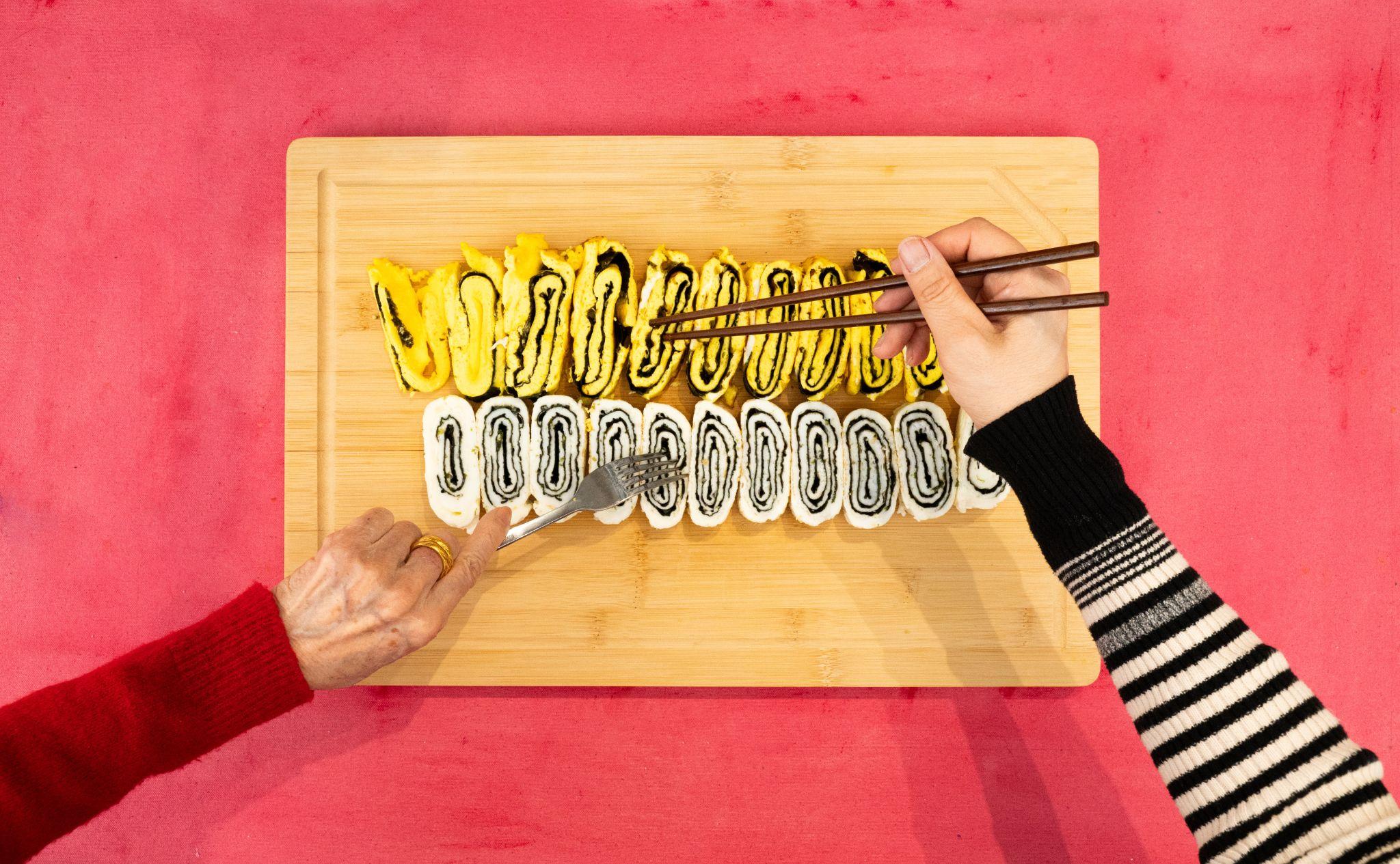 Kun Kyung Sok’s latest performance, “My Right Hand and Your Left Hand,” held at Space 776, invites audiences into an intimate and aromatic exploration of collaboration, creativity, and trust. The performance centers on Kun and her co-performer (a rolling cast of artists and non-artists) working together to prepare kimbap, a traditional Korean dish, using only her right hand and the other participant’s left hand. On opening night, while the salted streets of the Lower East Side froze, Kun’s audience huddled in close to witness a warm scene of clumsy vulnerability and palpable humor. “Armed” with a single knife, the two performers navigated the challenges of mutual control, toppling salt shakers and spilling rice, all the while the hypnotic scent of freshly prepared food permeated the space.