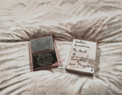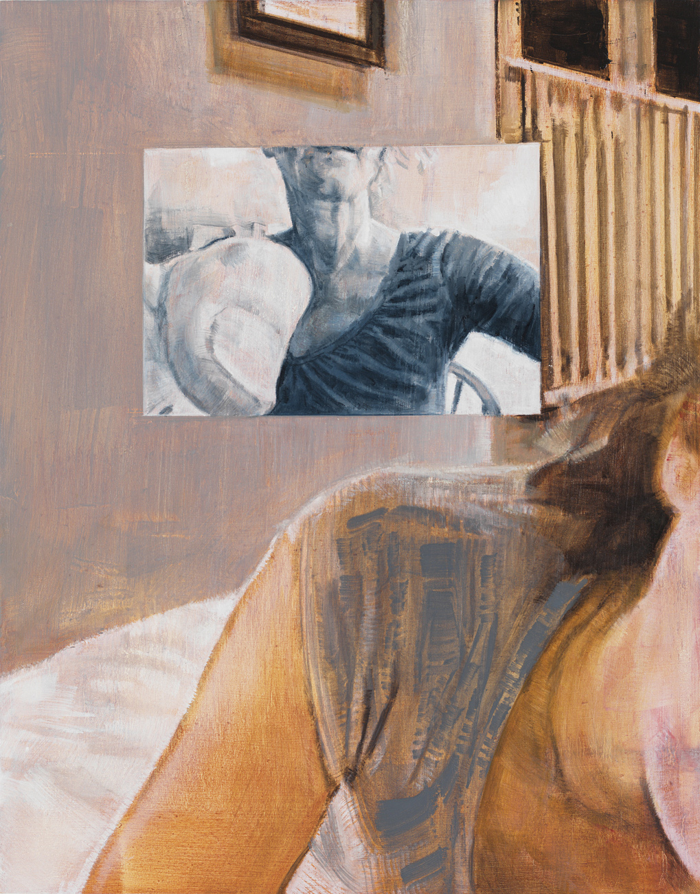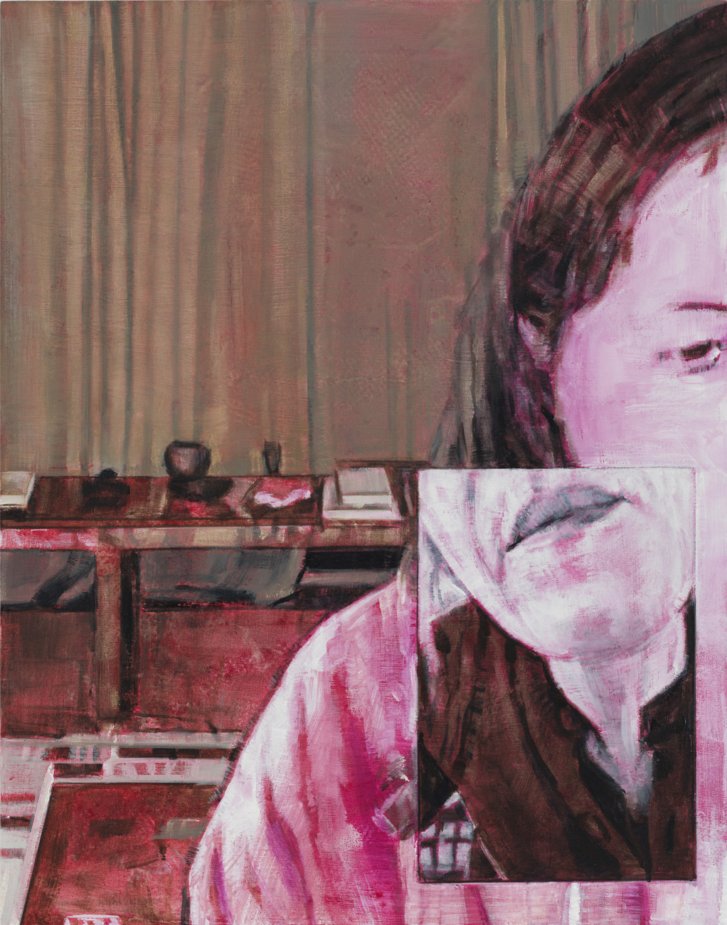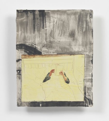 Selfies in domestic interiors, mobile phones, and computer screens are ubiquitous throughout Laura Karetzky‘s paintings. Her fragmented figures inhabit familiar interior spaces such as a bedroom or a work space, resonating altogether the uncanny in our daily experiences in this digital age, where the boundaries between space, time, self and other become increasingly blurred and at times even disorienting. In