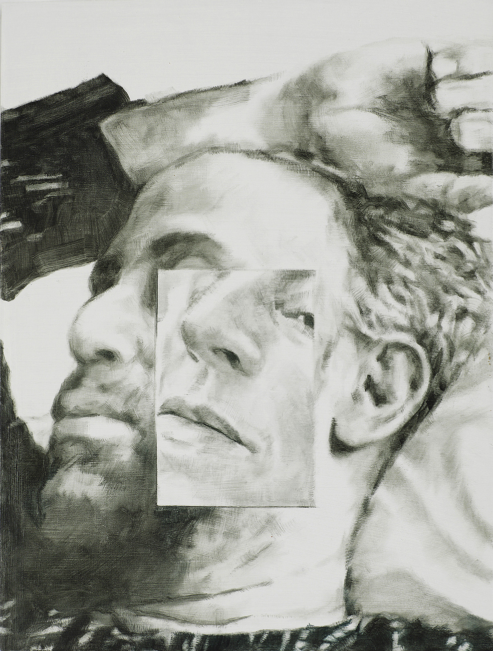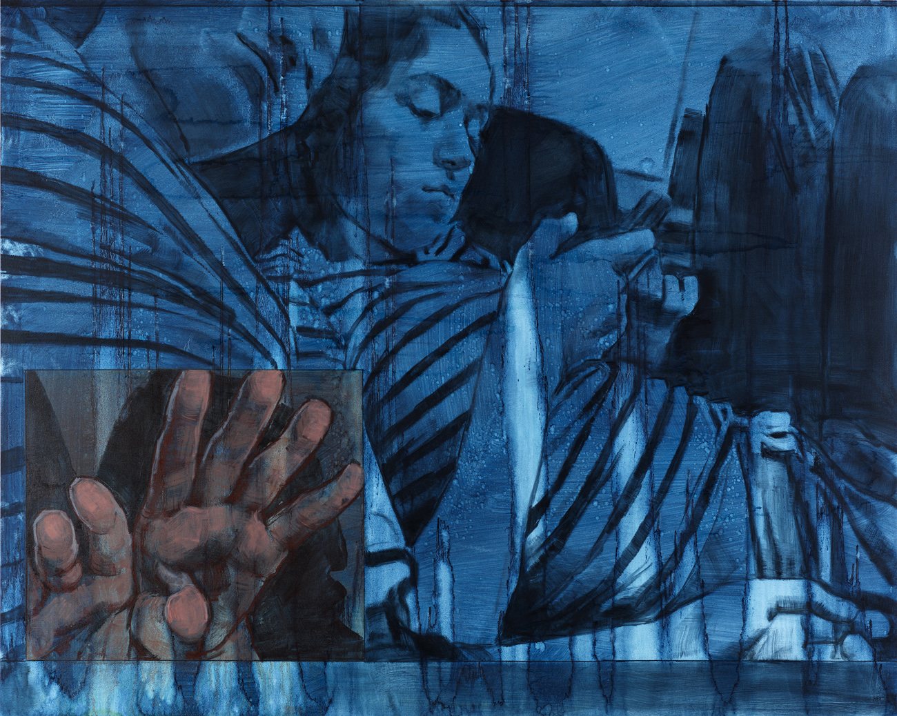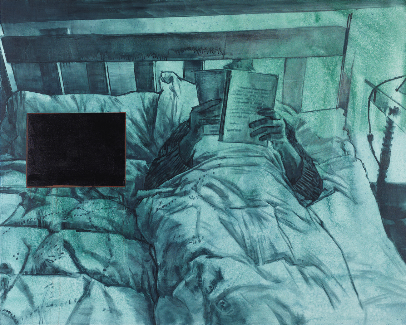 Selfies in domestic interiors, mobile phones, and computer screens are ubiquitous throughout Laura Karetzky‘s paintings. Her fragmented figures inhabit familiar interior spaces such as a bedroom or a work space, resonating altogether the uncanny in our daily experiences in this digital age, where the boundaries between space, time, self and other become increasingly blurred and at times even disorienting. In