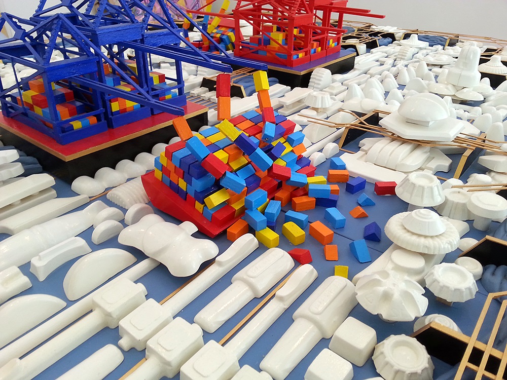The group of international artists throughout the two exhibitions at the Visual Arts Center of New Jersey – “Containment” and “Oh what a world! What a world!” are altogether reflecting on social, political, and cultural changes in recent history. “Oh what a world! What a world!”, located in the Main Gallery, addresses a wide array of issues related to immigration, gender equality, civil rights, policing, protest, and the state of our Democracy. “Containment”, at the Eisenberg and Strolling Gallery, addresses specifically hot trade issues – how the use of shipping containers affects our ability to trade and ship goods globally, coming to the forefront with Trump’s attempts to remove the country from existing trade deals. Both shows were curated by Mary Birmingham. The following preview on the two shows is largely based on text provided by the NJ Visual Arts Center.