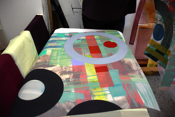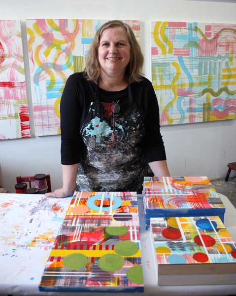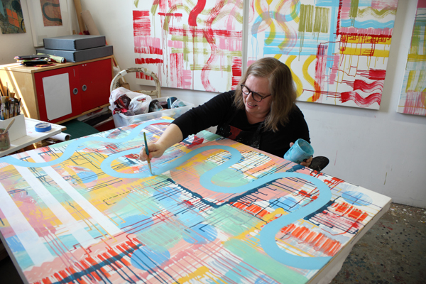 [caption id="attachment_2055" align="alignnone" width="500"] Linda Schmidt working on a canvas[/caption]
