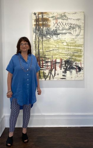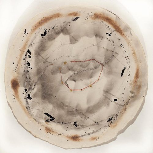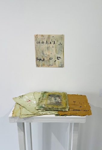 The current exhibition at Susan Eley Fine Art, Hudson features Lisa Pressman’s newest encaustic paintings and works on paper. One of the primary series on view in this show is entitled Messages, a recent and ongoing series of mixed media works on various handmade papers. Pressman collects handmade paper, including Japanese Shikishi board, which is edged with gold, as well as Letraset—the rub-on letters employed by graphic designers before the computer era. Onto these unique handmade paper, she employs the press-on letters of the Letraset, as a mark-making tool to create a symbolic language—hieroglyphic and intuitive.
