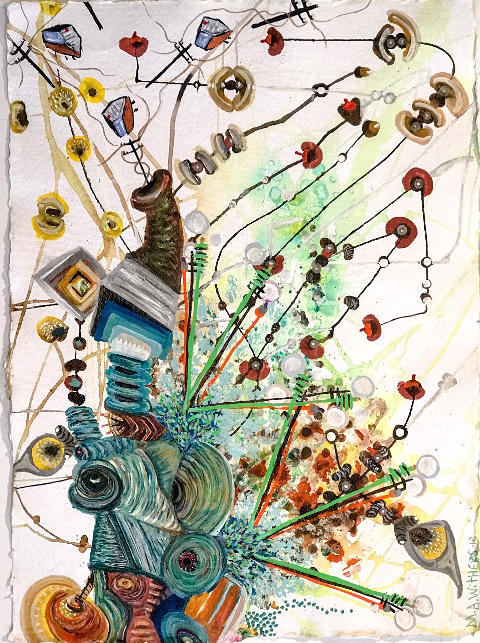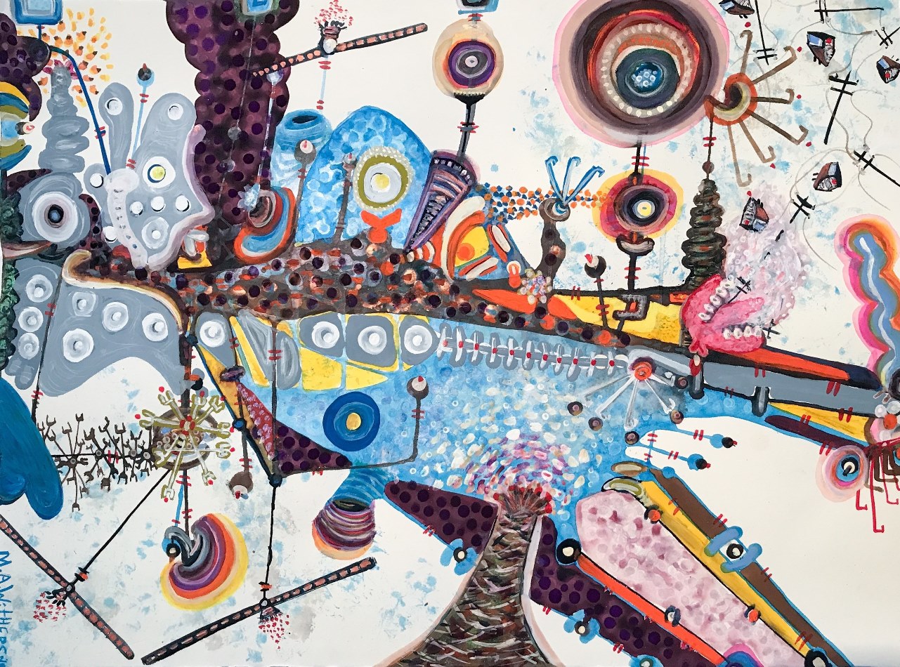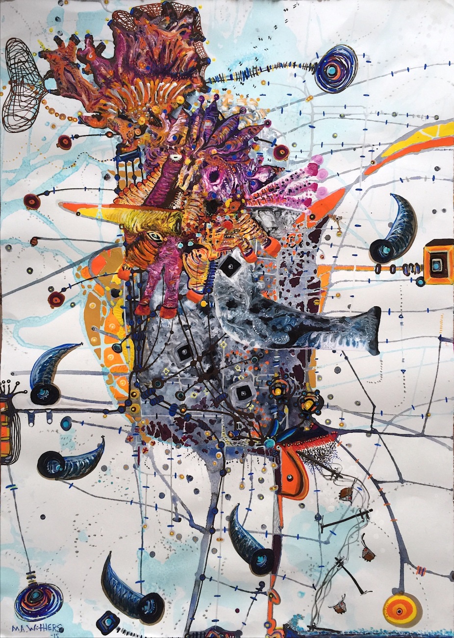 Margaret Ann Withers‘ drawings and paintings burst with energetic gestures, exuberant colors, and bio-morphic shapes. Altogether these elements fuse into imaginative landscapes resembling a child’s play in Surreal terrains. The artist shares with Art Spiel her ideas, process, and current projects.
