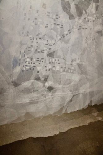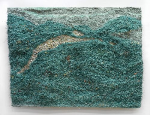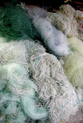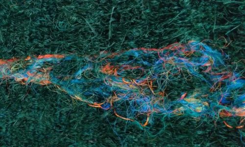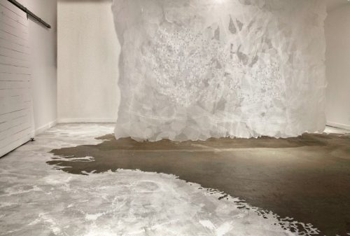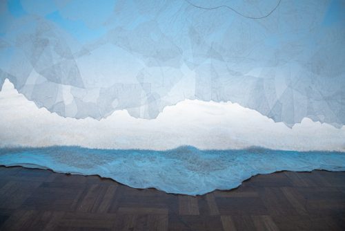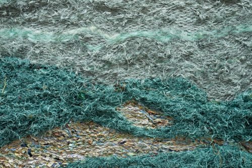 Hawai’i-based fiber artist Mary Babcock uses discarded fishing nets and lines as well as household wax paper to create tapestries and installations about sea level rise, “our proclivity towards destruction or entanglement,” and our perceptions of and relationship to water. The process of self-laminating wax paper for installations and of cleaning, sorting, and unravelling abandoned, tangled fishing nets and lines and then weaving them into something completely new, is the manifestation of her refusal to see anything as unworkable or unrepairable, including the climate crisis.