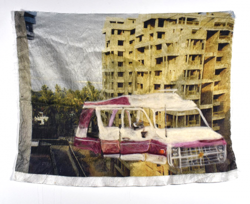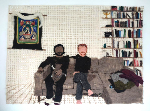 Intergenerational, 42 x 131 in, needle felted wool and sari silk on inkjet print on Indian duppioni silk, 2020-2021