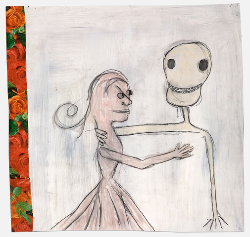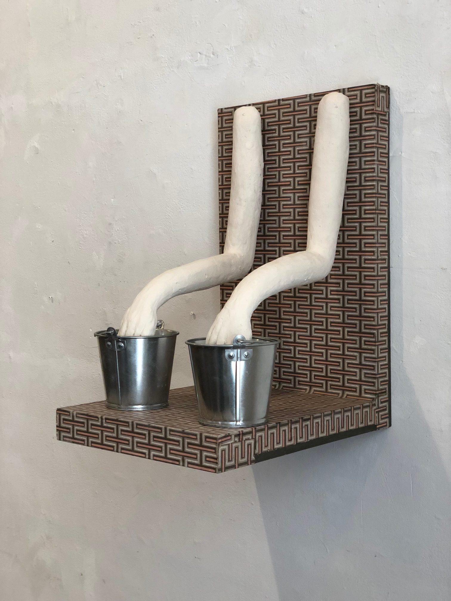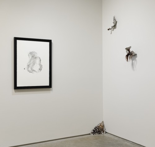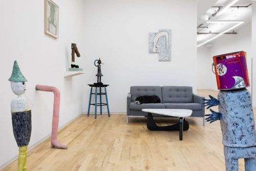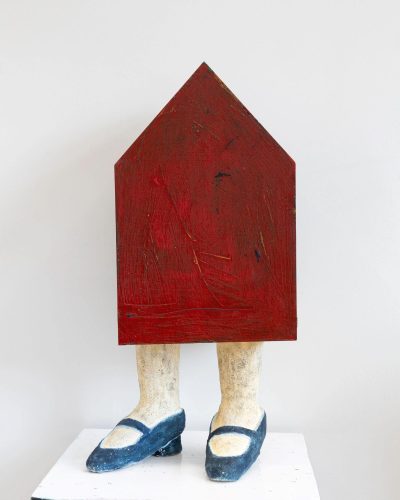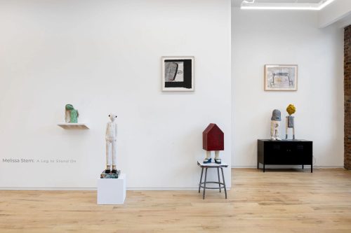 In Melissa Stern: A Leg to Stand On, the domestic meets the fantastic in the aptly named The Living Room, the front room exhibition space at DIMIN complete with a cozy two-seater sofa. Featuring her drawings and sculptures, Stern’s trademark humor and sense of play persists while the underlying thread of darkness that pervades her oeuvre feels especially heightened in this presentation. Deeply shaken by a fall during a winter walk in 2021, the artist’s works in the exhibition explore the precarious and fragile construction of the human body. Cobbling together disparate elements such as vintage shoes, wooden branches, scrap pieces of bannister railings, a doll’s lost arm, linoleum, wallpaper, resin, clay, paint cans, bolts, and screws, Stern balances absurdity with familiarity.